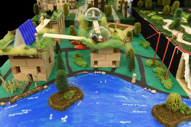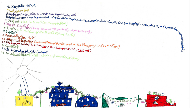 „Im Brückenpark gibt es viel Natur. Es ist viel Raum für öffentliche Plätze und Urlandschaften erhalten geblieben. Für Sportveranstaltungen der Vereine liegt ein Gebäude mitten im Grünen. In den Hochgärten wird Gemüse angebaut, damit man sich weitestgehend selbst versorgen kann. Wichtig ist mir auch, dass die Stadt ihre benötigte Energie selbst erzeugt, und zwar durch Windräder, Solaranlagen (blau) und Regenwasserturbinen (schwarz) auf den Dächern. Laute und staubverursachende LKWs sind nicht nötig, da die Frachten nachts durch unter den Parkbrücken fahrende Hängebahnen (rot) transportiert werden. Ebenso sind PKWs unnötig, da die Bahnen auch für den Personentransport genutzt werden.“