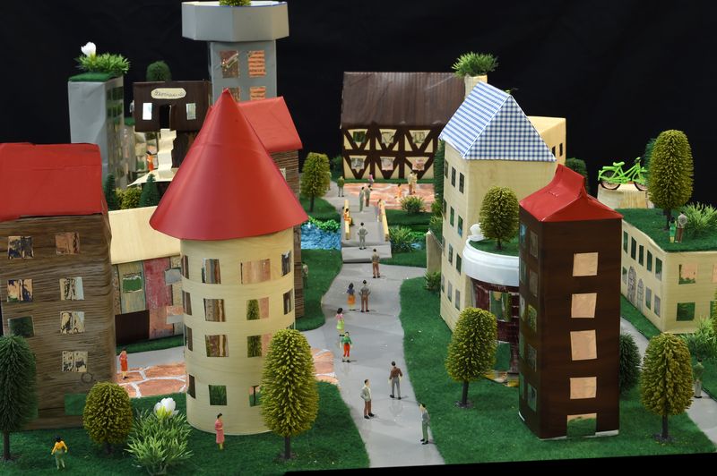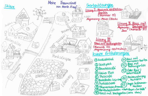 „In meiner Traumstadt soll vor allem auf die Natur aufmerksam gemacht werden. Jedes Haus soll zum Beispiel mindestens 6 qm Garten zur Verfügung haben, denn frische Luft ist entspannend und gesund. Es wäre auch schön, viele Bäume in der Stadt angepflanzt zu haben. Da es keine Autos gibt (außer die Lieferwagen der Geschäfte), könnten die Abgase die Natur in der Stadt nicht verschmutzen. So fühlt man sich wie im Dorf, ist jedoch auch nah an Ärzten und Geschäften. Im Modell möchte ich Häuser mit besonderen und verschiedenen Gärten darstellen, außerdem Stationen eines stadtweiten, nicht profitorientierten Leihradsystems, ein Baumhauscafé, eine Bibliothek und kleine privat betriebene Läden.“