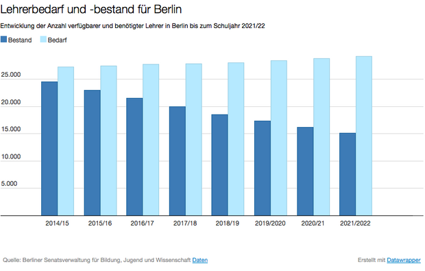Ein weiteres Problem betrifft alle Schulen in Berlin: Es mangelt an Lehrern. 2673 fehlen allein im Schuljahr 2014/15. Und in den kommenden acht Jahren wird sich die Schere zwischen Lehrerbedarf und Lehrerbestand weiter öffnen. Für das Schuljahr 2022/23 rechnet die Senatsverwaltung damit, dass in Berlin 14.018 Lehrer fehlen werden.