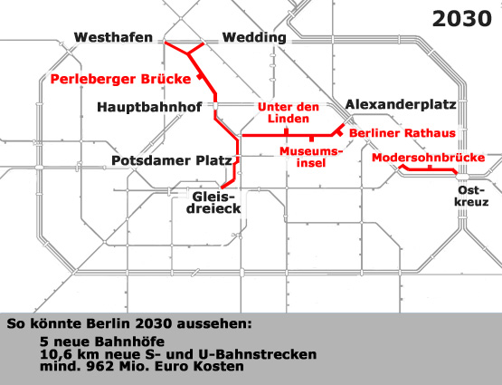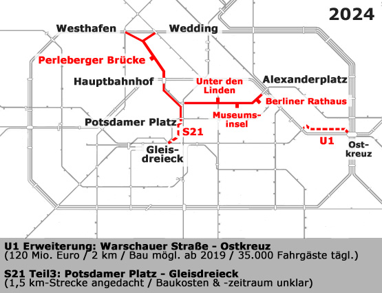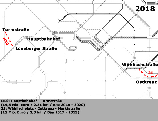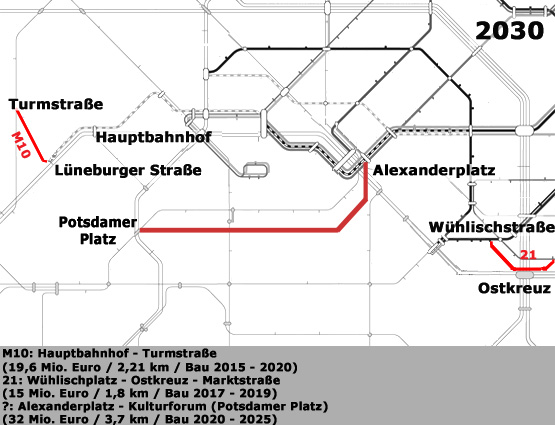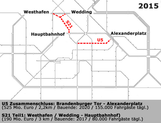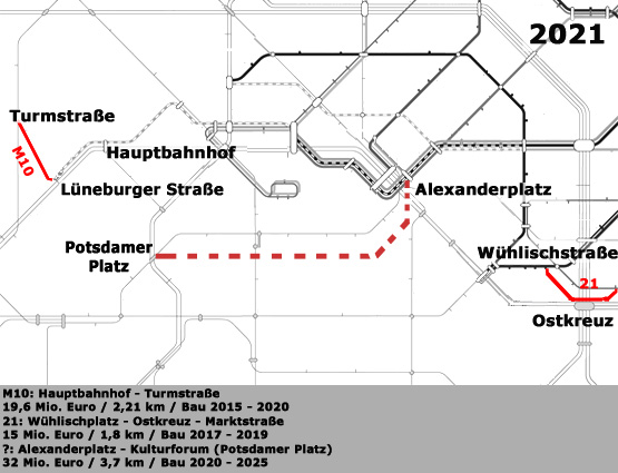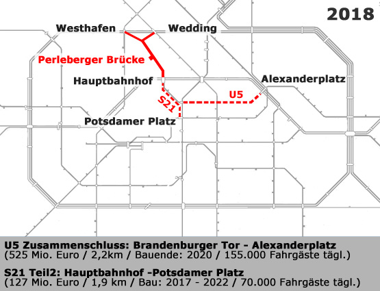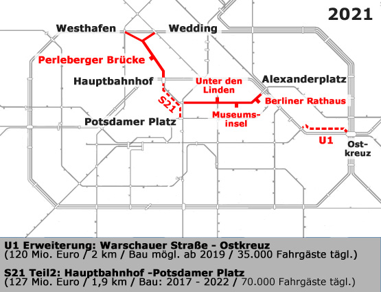 Wohl ambitioniertestes Projekt ist der Neubau der S-Bahn-Linie 21, die in Zukunft täglich bis zu 70.000 Fahrgäste von Westhafen über den Hauptbahnhof fast bis zum Südring bringen soll. In drei Etappen ist vorgesehen, die Strecke vom Nordring bis zum Gleisdreieck zu verlegen. Bis 2017 soll zunächst der Streckenabschnitt von Westhafen bis zum Hauptbahnhof fertiggestellt werden. Bis 2022 ist ein zweiter Abschnitt bis zum Potsdamer Platz in Planung. Ein dritter soll dann zum Gleisdreck führen. 353 Millionen Euro soll das Bauvorhaben bis 2022 kosten. Für den letzten Abschnitt hat die Senatsverwaltung noch keine Kalkulation bekannt gegeben.