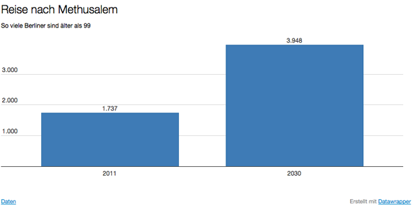 Berlin wird in Zukunft die deutsche Stadt sein, in der, in absoluten Zahlen, die meisten Alten leben werden. Die Anzahl der Älteren wird bis 2030 deutlich ansteigen. Bei den über 80-Jährigen sogar um 80 Prozent. Berlin profitiert aber vor allem von der Zuwanderung jüngerer Leute. Eine wirklich alte Bevölkerung findet man eher in Brandenburg.