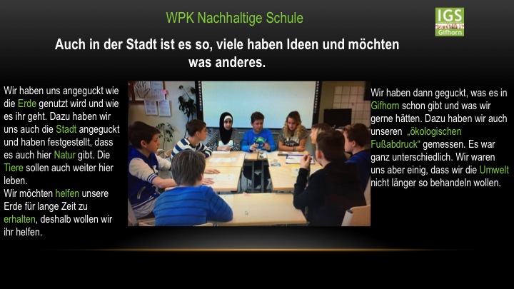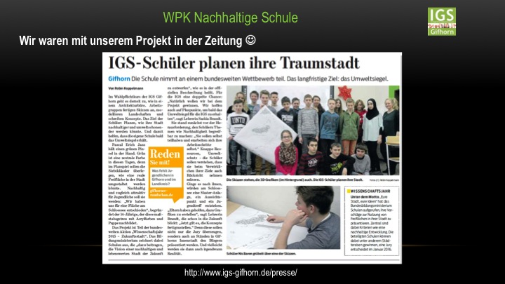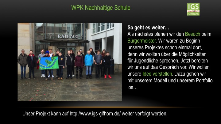 „Die Schülerinnen und Schüler präsentieren auf eindringliche Weise, wie sie sich an das Thema Nachhaltigkeit herangetastet haben. Im Vorfeld ermittelten sie dafür sogar ihren eigenen „ökologischer Fußabdruck“. Bei der Planung ihres Jugendtreffs orientieren sie sich stets an den zu Beginn festgelegten Zielen. Man spürt, dass die Jugendlichen mit Begeisterung hinter ihrem Projekt stehen. Ich wünsche ihnen viel Erfolg für ihr Treffen mit dem Bürgermeister der Stadt.“ (Prof. Dr. Undine Giseke, Fachgebietsleiterin landschaftsarchitektur.freiraumplanung (TU Berlin), Jurymitglied)