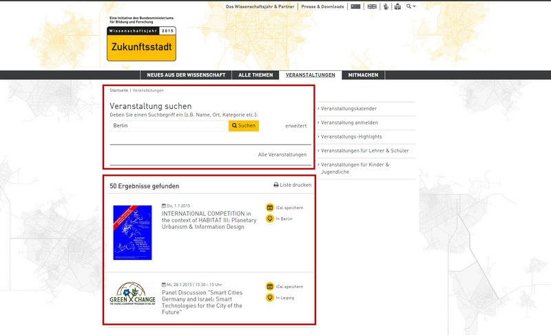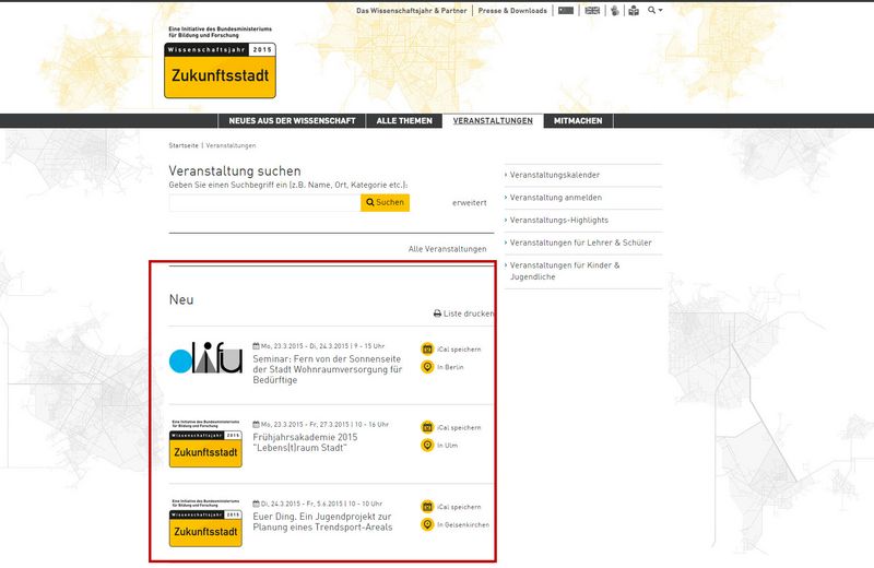 Wenn Sie kein Such-Wort im Suchen-Feld eingeben, werden alle Veranstaltungen zum Thema „Zukunfts-Stadt“ angezeigt.