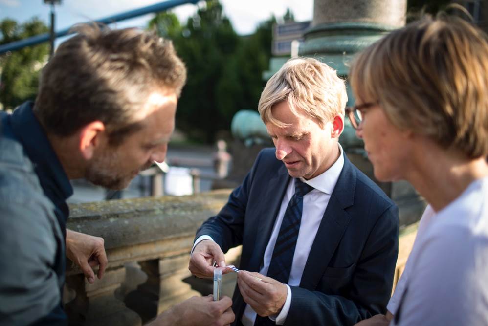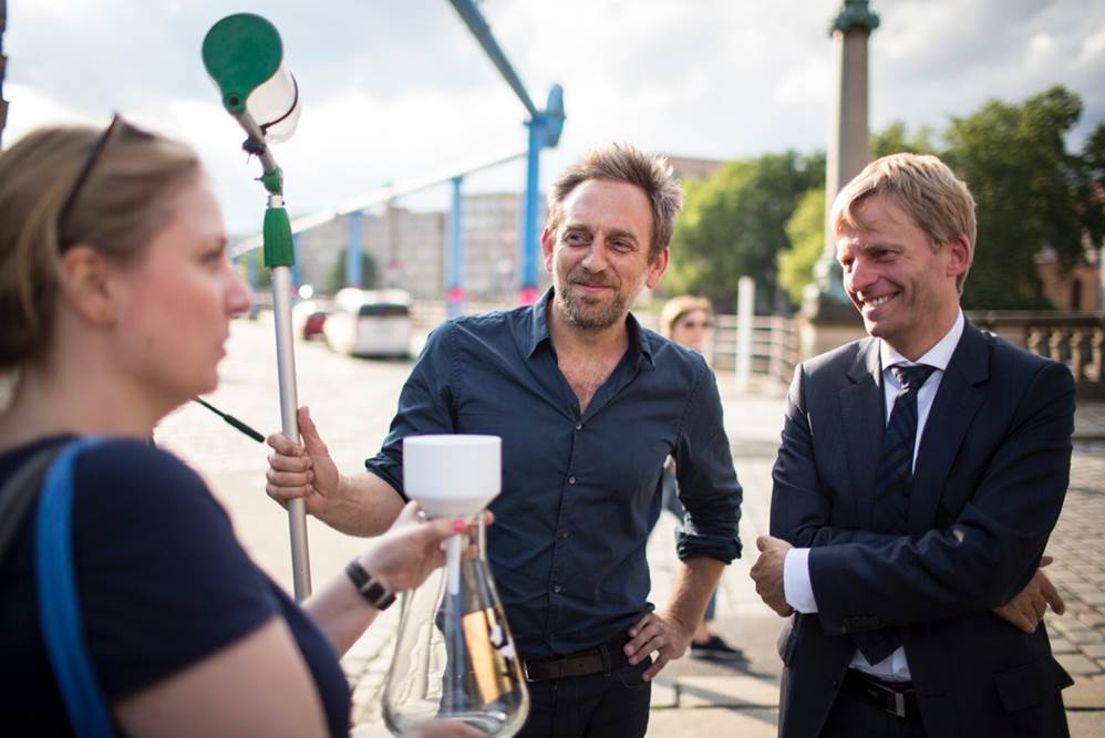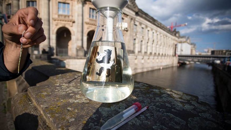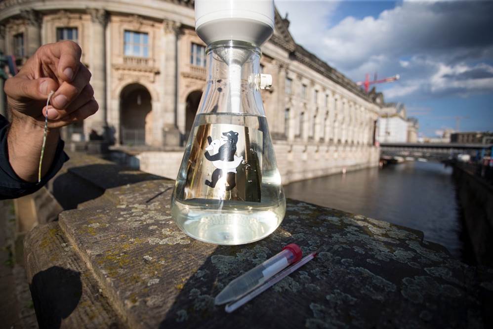 Für Flussbad Berlin ist Rüdiger Kruse, MdB, im Einsatz: qua Amt Kultur und Umweltschutz vereinend, entnimmt er im Spreekanal eine Probe. Im Rahmen des „My Ocean Sampling Day“ entnehmen engagierte Bürgerinnen und Bürger in Deutschland ihren Flüssen ganztags Wasserproben und schicken sie zur DNA-Analyse zum Max-Planck-Institut für Marine Mikrobiologie nach Bremen. Zusammen mit den Proben von Wissenschaftlerinnen und Wissenschaftlern ergibt das den größten Datensatz, der je an einem einzigen Tag erstellt wurde.