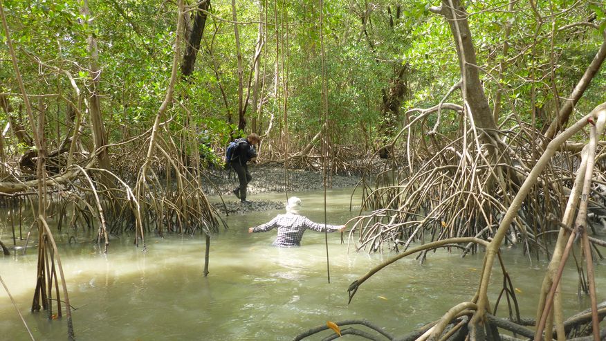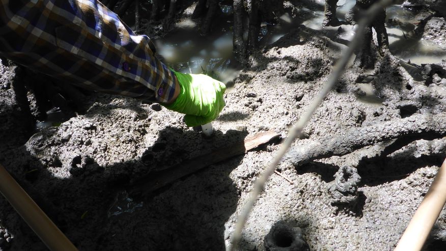 Für die folgenden zwei Wochen stehen Sedimentproben auf dem Programm. Wir wollen mit molekularbiologischen Methoden die Zusammensetzung der Mikroorganismen- und Tierarten im Sediment verschiedener Mangrovenvegetationstypen erfassen und mit der chemischen Zusammensetzung der organischen Substanz in Beziehung setzen. Letztendlich möchten wir verstehen, wie die Ökosystemleistungen der Mangroven (z.B. die Produktion großer Mengen von Krabben) mit der Lebensgemeinschaft in der Mangrove zusammenhängen und wie letztere geschützt werden kann, um diese Leistungen aufrechtzuhalten. Denn Mangroven gehen weltweit mit einer Flächenverlustrate verloren, die zwei- bis dreimal höher ist als die der tropischen Regenwälder.