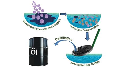 Kana M. Suresan und Annamalai Prathap vom Indian Institute of Science, Education and Research (IISER) Thiruvananthapuram in Kerala, entwickelten eine erstaunlich einfache Strategie und testeten diese in ihrer aktuellen und in der Fachzeitschrift 'Angewandte Chemie' veröffentlichten Studie. Sie kombinierten hierfür die Verfahren Absorption und Gelbildung. Als preiswerten porösen Trägerstoff wählte das Forscherteam Cellulose. Diese imprägnierten sie mit einem Öl-Geliermittel, einer organischen Mannitolverbindung. Damit wird die Cellulose schwimmfähig, da sie im Gegensatz zum unbehandelten Zustand nun fast kein Wasser aufsaugt. Der entscheidende Vorteil besteht darin, dass durch die Imprägnierung ein feinfaseriges Netzwerk entsteht. Dieses fängt das Öl ein und bildet ein starres Gel. Selbst vollgesogen mit Öl sinken die Körner nicht, sondern bleiben an der Oberfläche. Durch die Gelierung wird somit die flüssige Ölphase fest und kann abgeschöpft werden. Das ausgetretene Öl ließe sich mit diesem Verfahren sogar recyceln. Wie das Forscherteam demonstrierte, kann man durch Ausquetschen oder Destillation das Öl aus den geronnenen Körnern zurückgewinnen.