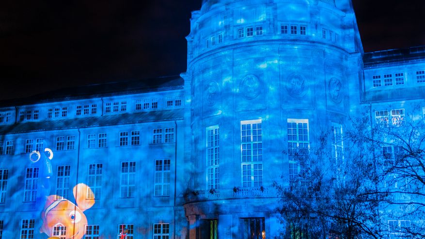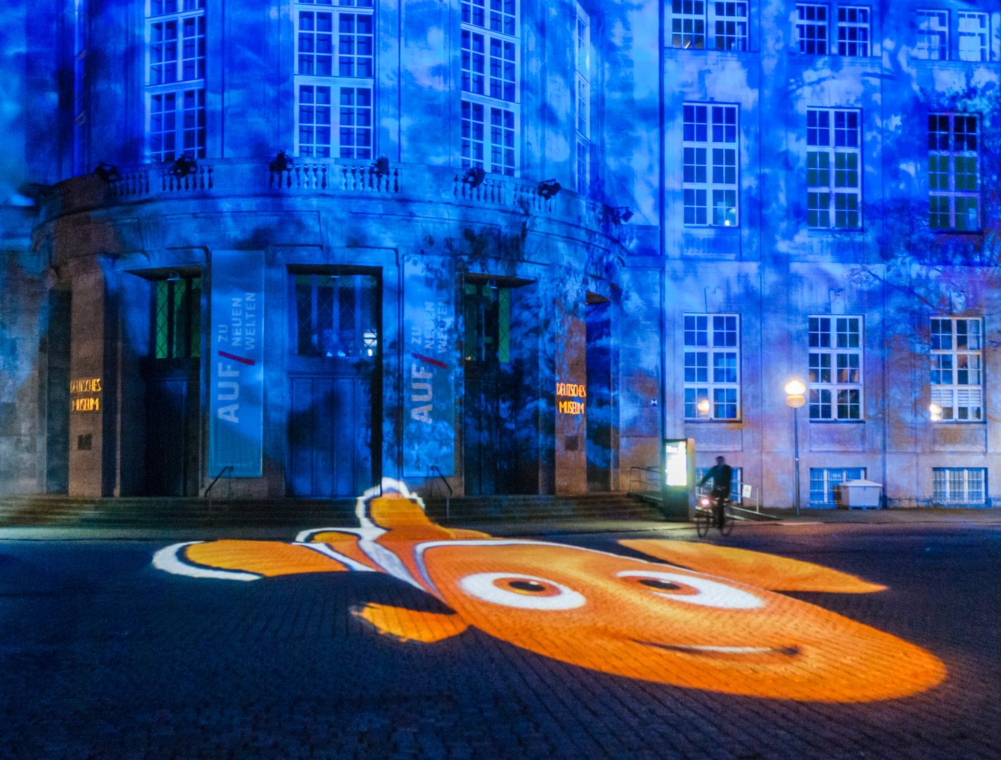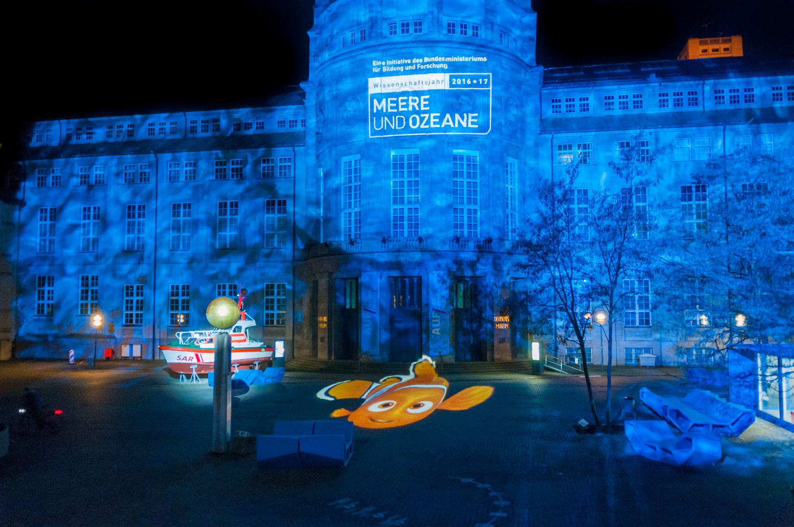 Die Fassade des Museums wird von 17 bis 22 Uhr beleuchtet, außerdem hat man Meeresrauschen und Walgesänge im Ohr – und schließlich werden im Blauen Schiffs-Container Film-Clips gezeigt, die Einblicke in die aktuelle Meeresforschung geben.