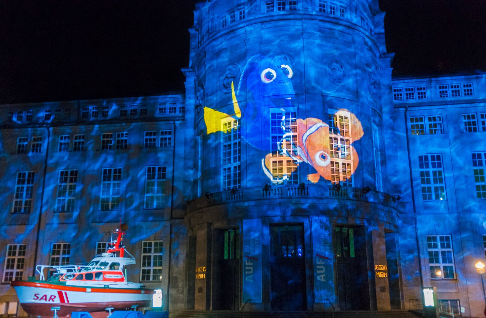 Ein Strahlentierchen aus dem Meer prangt wie eine riesengroße Adventsdekoration am Museumsturm, an der Fassade werden ein Forschungs-U-Boot und ein Taucher aus der Ausstellung „Meeresforschung“ gezeigt – und schließlich kommen auch noch zwei bekannte Filmstars aus dem Meer vorbei. Und auch das Seenotrettungsboot „Asmus Bremer“ wird richtig in Szene gesetzt. Schon bei dem ersten Test am blieben Passanten fasziniert im Museumshof stehen. Ab Samstag kommt auch noch eine Meeres-Geräuschkulisse dazu – so dass man sich tatsächlich im Innenhof des Museums ein bisschen so fühlt, als sei man unter Wasser.