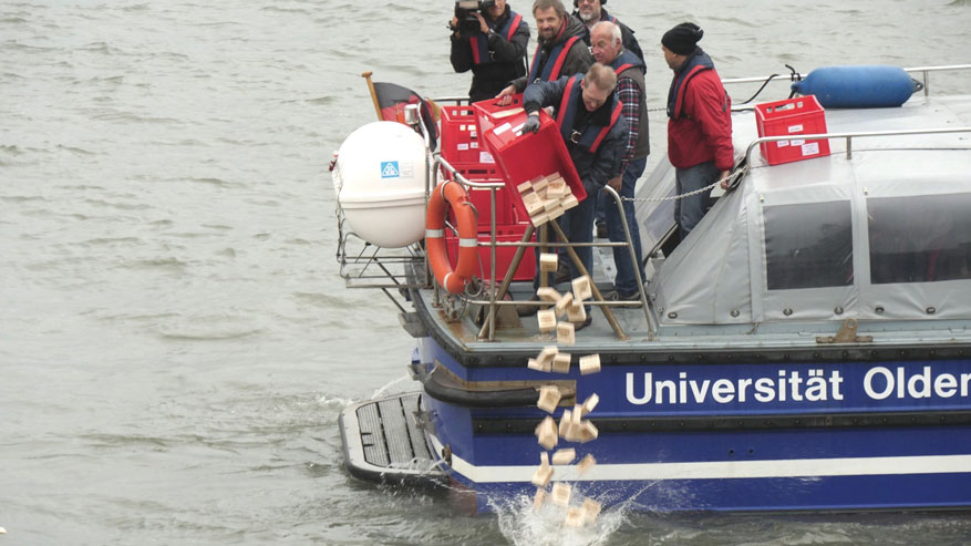 Wissenschaftler des Verbundprojekts „Makroplastik in der südlichen Nordsee – Quellen, Senken und Vermeidungsstrategien" der Universität Oldenburg starten eine Mitmach-Aktion: In den kommenden Wochen setzen sie die ersten 4.800 von insgesamt knapp 100.000 sogenannten Holzdriftern an norddeutschen Küsten, in Flüssen und auf Hauptschifffahrtswegen der offenen Nordsee aus. Bürger, die einen angeschwemmten Drifter finden, sind aufgerufen, diesen zu melden.