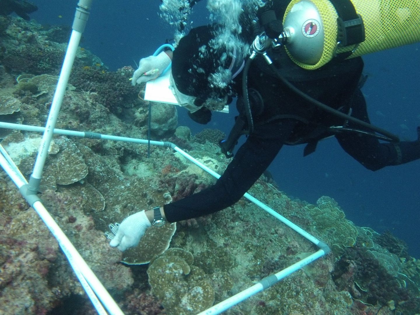 Die Suche nach sogenannten Rekruten, also Korallenlarven, die sich angesiedelt und begonnen haben, ein Kalkskelett auszubilden, war vor allem innerhalb des Schutzgebietes erfolgreich. Stellenweise konnten wir dort bis zu zehn Rekruten pro Quadratmeter finden. Auf dem Riffdach, dem obersten Stockwerk des Korallenriffs, werden schon drei bis fünf Rekruten pro Quadratmeter als gute Werte angesehen.