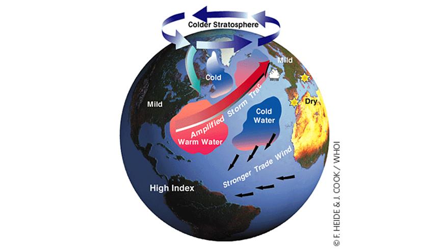 In Erdoberflächennähe führt das zu einer Veränderung von regionalen Luftdruckmustern. Ein Beispiel für so ein regionales Druckmuster ist die Nordatlantische Oszillation (NAO), eine Luftdruckschaukel zwischen dem Islandtief und dem Azorenhoch, die das Winterwetter in Europa maßgeblich bestimmt. Stark ausgeprägte Druckmuster über Island und den Azoren führen zu stärkeren Westwinden und damit zu mehr Tiefdruckgebieten über dem Atlantik, die zu relativ warmen und milden Wintern in Europa führen. Umgekehrt hat man bei schwach ausgeprägten Druckmustern über dem Atlantik schwächere Westwinde und somit relativ kühle und schneereiche Winter in Europa. In Jahren starker Sonnenaktivität beobachtet man nun eine stärkere NAO und damit relativ nasse und warme Winter, während es in Jahren geringer Sonnenaktivität zu kalten und schneereichen Wintern kommt. Dieses Sonnensignal in der NAO findet man etwa zwei Jahre nach dem Maximum in der Sonnenaktivität und wird vermutlich durch ein Zusammenspiel von Atmosphären- und Ozeanströmungen über dem Nordatlantik verursacht.
