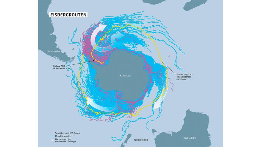 Später dürfte er einen Bogen in Richtung Nordosten schlagen und entlang der nördlichen Grenze des Weddellwirbels weiter nach Osten treiben. Dabei könnte er, wie andere Eisberge zuvor auch, Südgeorgien oder die Süd-Sandwichinseln erreichen und auf diesem Weg in großem Ausmaß an seiner Unterseite zu schmelzen beginnen. Die Reise hierher könnte dann bereits zwei bis drei Jahre gedauert haben.