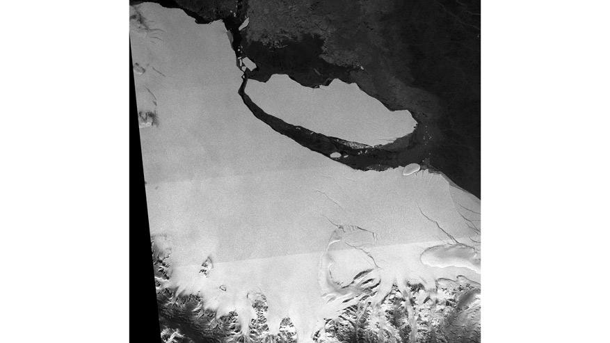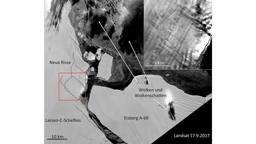 Am 12. Juli 2017 war es soweit: Der Riss im Larsen-C-Schelfeis, der über die letzten Jahre mit Satellitendaten beobachtet wurde, erreichte die Eisfront und ein etwa 5800 Quadratkilometer großer Tafeleisberg löste sich ab. Die neue Eisfront des Larsen-C-Schelfeises hatte sich weiter zurückgezogen als jemals zuvor beobachtet.