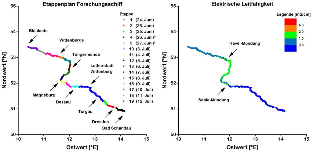 Die Auswertung der BIOFISH-Daten zeigt, dass bei keinem der gemessenen Parameter besonders auffällige oder gar bedenkliche Werte in Bezug auf aktuell gültige Grenzwerte auftraten. Allerdings war die Wasserzusammensetzung entlang der Messstrecke sowohl zeitlichen als auch regionalen Einflüssen unterzogen. Regionale Veränderungen waren dabei in erster Linie den größeren Elbe-Zuflüssen wie der Saale oder Havel geschuldet, die mit einer anderen Zusammensetzung mit sich führten. Als Beispiel hierfür ist unter anderem die sich verändernde elektrischen Leitfähigkeit der Elbe zu nennen (Abbildung 1 rechts). Diese gibt die Menge an gelösten geladenen Teilchen (Ionen) an und ist ein Maß für den Salzgehalt eines Gewässers. Aufgrund des allgemein höheren Salzgehaltes der Saale war nach dem Zusammenfluss von Saale und Elbe ein signifikanter Anstieg der elektrischen Leitfähigkeit der Elbe zu verzeichnen. Im Bereich der Havel-Mündung ging der Salzgehalt der Elbe wieder zurück, da die Havel in dieser Zeit, insbesondere beeinflusst durch die starken Regenfälle im Raum Berlin am 07.07.2017, sehr viel Wasser mit einer geringen Salzkonzentration führte.