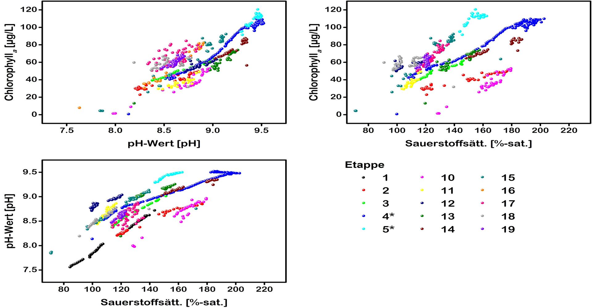 Veränderungen der Wasserzusammensetzung waren häufig im Tagesverlauf und in Abhängigkeit der aktuellen Wettersituation zu beobachten. Für diesen Effekt war die zum Zeitpunkt der Messkampagne vergleichsweise hohe Algenkonzentration verantwortlich, die die chemischen Prozesse innerhalb des Gewässersystems der Elbe in dieser warmen Jahreszeit maßgeblich bestimmte. Algen betreiben Photosynthese, bei der sie aus Kohlenstoffdioxid (CO2) und Wasser organische Verbindungen herstellen und als Nebenprodukt Sauerstoff (O2) erzeugen. In einem Gewässer führt dieser Prozess zu einem Anstieg der Sauerstoffsättigung, während aufgrund des Verbrauchs von CO2 gleichzeitig der pH-Wert des Wassers ansteigt (Säuregehalt des Wassers nimmt ab). In den Messdaten erkennt man diese Zusammenhänge an der positiven linearen Korrelation, die zwischen der Algenmenge (Chlorophylla-Konzentration), dem pH-Wert sowie der Sauerstoffsättigung existiert (Abbildung 2). Da die Photosynthese-Aktivität von Algen jedoch auf Sonnenenergie angewiesen ist, finden diese Prozesse verstärkt bei einer höheren Sonnenlichteinstrahlung statt. Dies hat zur Folge, dass bei sonnigem Wetter im Tagesverlauf meist ein Anstieg des pH-Werts und der Sauerstoffsättigung zu beobachten war, während die entsprechenden Werte an kühleren, bewölkten oder regnerischen Tagen aufgrund der geringeren Algenaktivität deutlich niedriger ausfielen.