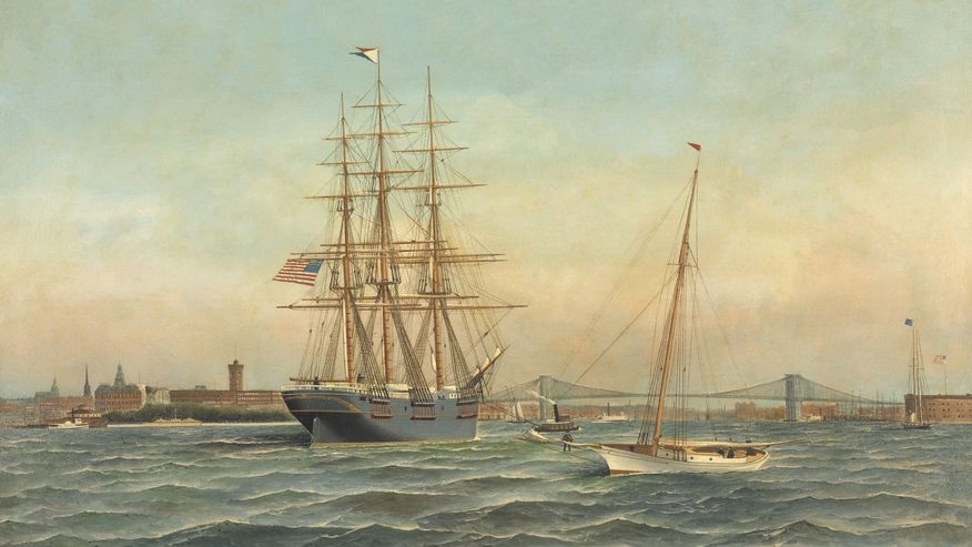 Charakteristisch für Gemälde mit Auswandererthematik ist, dass die Abfahrt vom alten Heimathafen stets von der Landseite gezeigt wird. Der Betrachter wird vom Künstler „zurückgelassen“. Dies bietet Raum, über die eigenen Wünsche und Sehnsüchte nachzudenken, die durch den Aufbruch des Schiffes ausgelöst werden. Die Ankunft im Zielhafen wird dagegen von der Wasserseite aus dargestellt, so auch bei Antonio Jacobsen, der von Dänemark nach New York auswanderte.