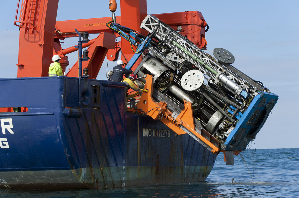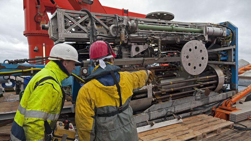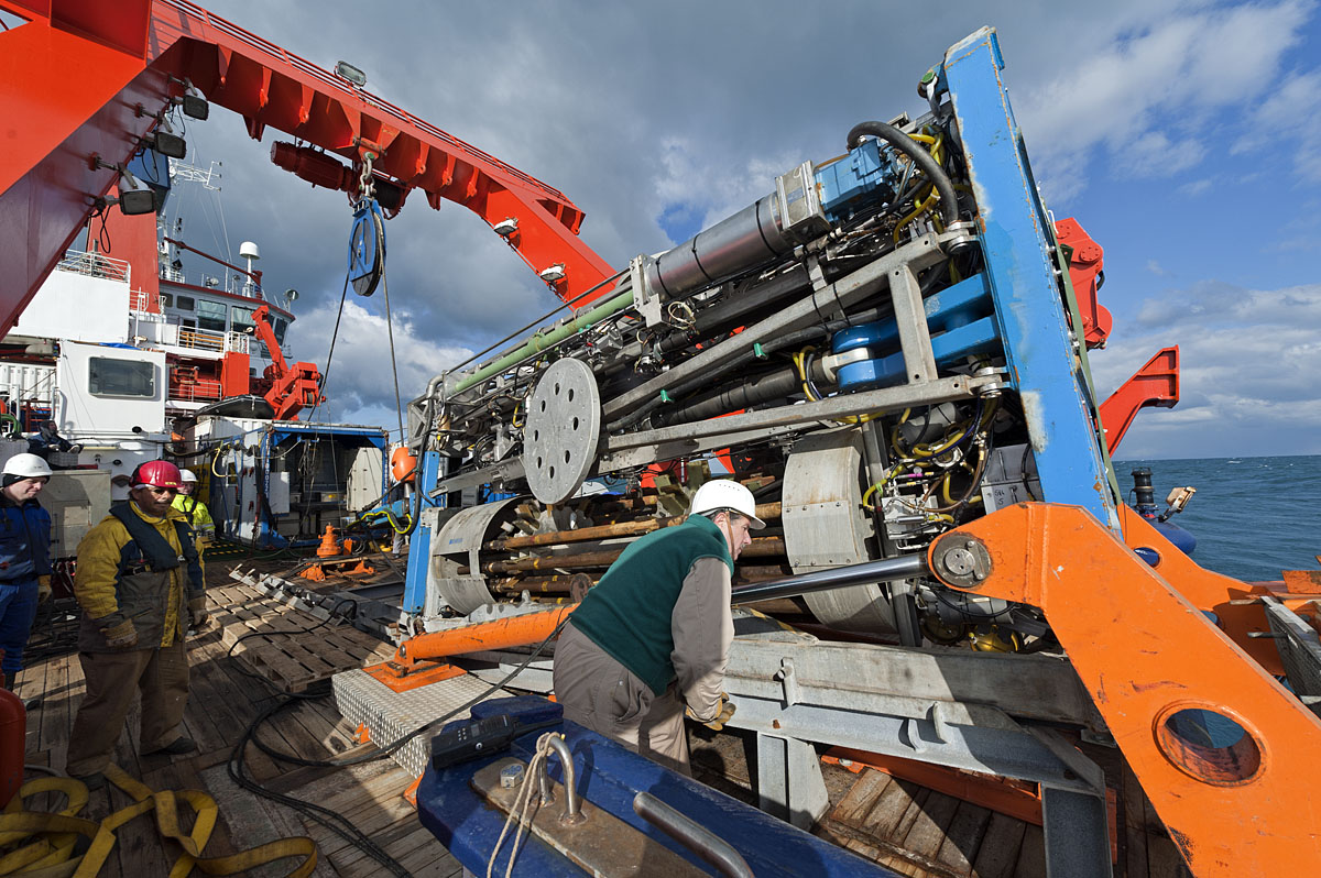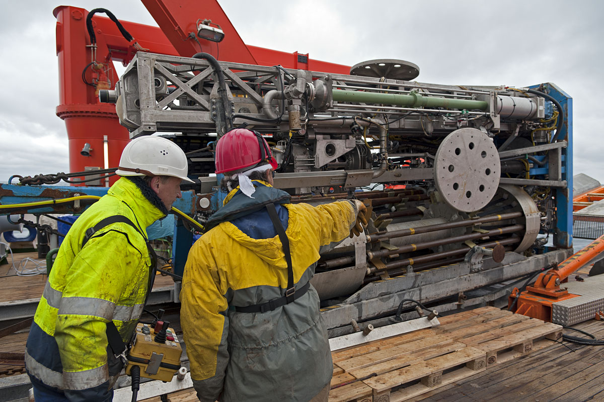 Dazu benutzen wir das Meeresbodenbohrgerät MeBo70 des MARUM, um bis zu 60 Meter tief in den Meeresboden zu bohren. So wollen wir untersuchen, wie die Methanhydrate in den Sedimenten des Kontinentalhangs vor Spitzbergen – also dort, wo der Meeresboden am steilsten abfällt – verteilt sind, wo Methanhydrate sich neu bilden und wo es Auflösung der Hydrate gibt. Außerdem wollen wir untersuchen, welche Einflüsse neben Temperatur und Druck die Stabilität von Methanhydraten beeinflussen. Während eines 14-tägigen ersten Abschnitts (MSM57-1) wird auf dem Vestnesa Rücken in etwa 1.200 Meter Wassertiefe gebohrt. Entlang des Rückens sind trichterförmige Vertiefungen vorhanden, aus denen freies Methangas austritt. Geophysikalische Untersuchungen haben in den Sedimenten des Rückens kaminartige Strukturen unterhalb der Trichter identifiziert, in denen das freie Gas aufsteigt. Die Forscherinnen und Forscher vermuten, dass in den Spalten und Klüften im Meeresgrund sehr warmes Wasser zirkuliert, das letztlich die Methanhydrate auflöst und das Methan freisetzt. Diese Vermutung soll mit Bohrungen in den Kaminen und ihrer Umgebung nachgegangen werden.