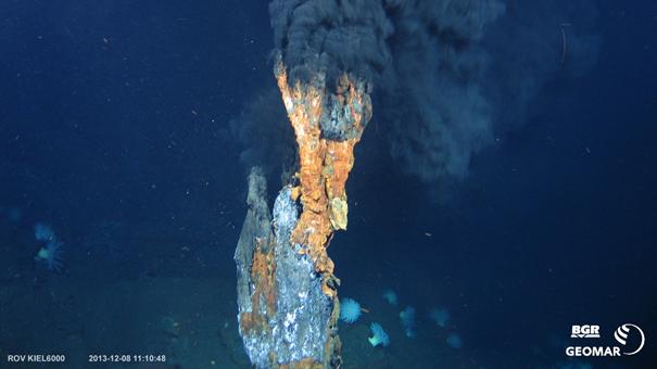 Das erhitze Meerwasser laugt die Metalle aus dem Gestein und führt sie gelöst mit. Steigt diese Lösung wieder auf, tritt sie als bis zu 400 Grad Celsius heiße schwarze Fontäne, den sog. „Schwarzen Rauchern“, am Meeresboden aus. Beim Kontakt mit dem nur 2 Grad Celsius kaltem Meereswasser kühlt die Lösung schlagartig ab, dabei werden die gelösten Metalle als Mineral fixiert. Um die Austrittsstelle bildet sich ein säulenförmiger Erzschornstein. Er kann mehrere Zentimeter pro Tag wachsen. Der Schornstein sitzt einem Erzhügel auf und markiert gewissermaßen das Erzvorkommen im Untergrund. Früher oder später erlischt die heiße Quelle. Der Erzschornstein wird inaktiv.