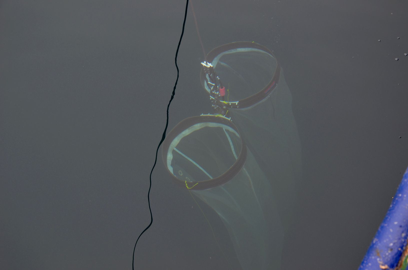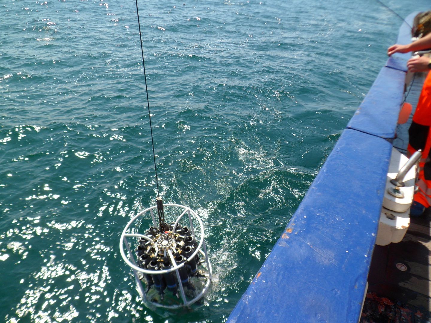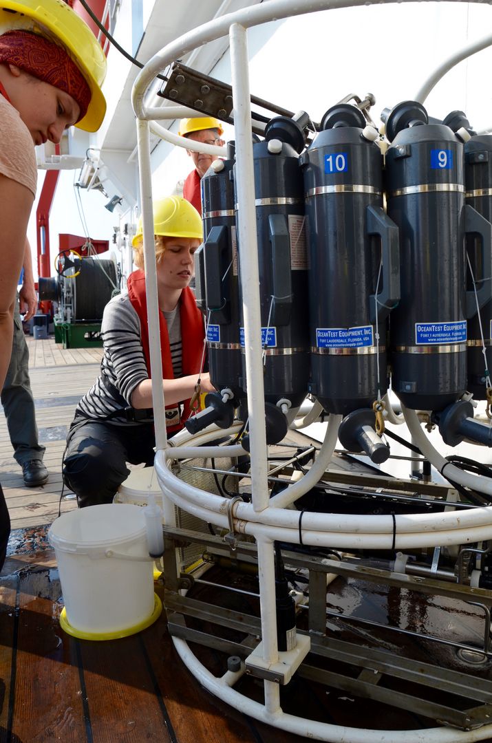 Wie auch auf den folgenden Stationen beginnt die Stationsarbeit mit den Messungen der Hydrographie. Eine Sonde (CTD) mit Sensoren für verschiedene Umweltgrößen und daran angebaute Wasserschöpfer werden zu Wasser gelassen, um den Salzgehalt, die Wassertemperatur und die Menge der Algen in der Wassersäule zu messen. Diese Werte stellen eine wichtige Grundlage dar, um den Lebensraum zu beschreiben, denn Temperatur und Salzgehalt bestimmen maßgeblich das Vorkommen von Arten. Danach erfolgt auf jeder Station eine Probennahme mit dem Grundschleppnetz, dem Multinetz und dem Bongo-Netz.