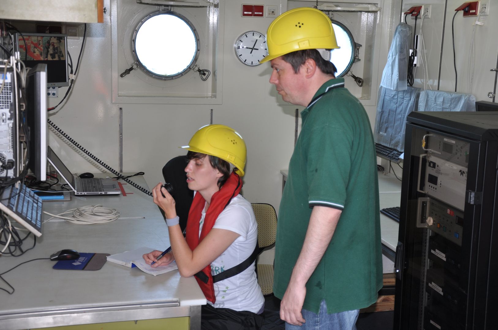 Auch am Abend ist noch lange nicht Feierabend: Die Daten werden in den Computer eingegeben und erste Analysen der Daten durchgeführt. Dabei ergeben sich oft sehr lehrreiche Diskussionen nicht nur über die Ergebnisse, sondern auch über andere Themen der Meereswissenschaften. Yasemin, eine Studentin im zweiten Semester des Masterstudiengangs an der Universität Bremen, sagte: „In dieser Woche habe ich mehr gelernt, als in einem Semester an der Universität.“ – „Ja“, betonte Jenny, „es ist die Kombination aus praktischen Arbeiten an Bord unter realen Expeditionsbedingungen und der gemeinsamen Analyse der erarbeiteten Daten sowie die Diskussion darüber, die das Lernen so erfolgreich macht.“ Alle pflichteten ihnen bei und Aurelia ergänzt: „Hier an Bord erlebt man hautnah, wie groß das Meer ist und welche Methoden man zur Verfügung hat, um die Geheimnisse und Zusammenhänge dieses Lebensraums zu entdecken.“
