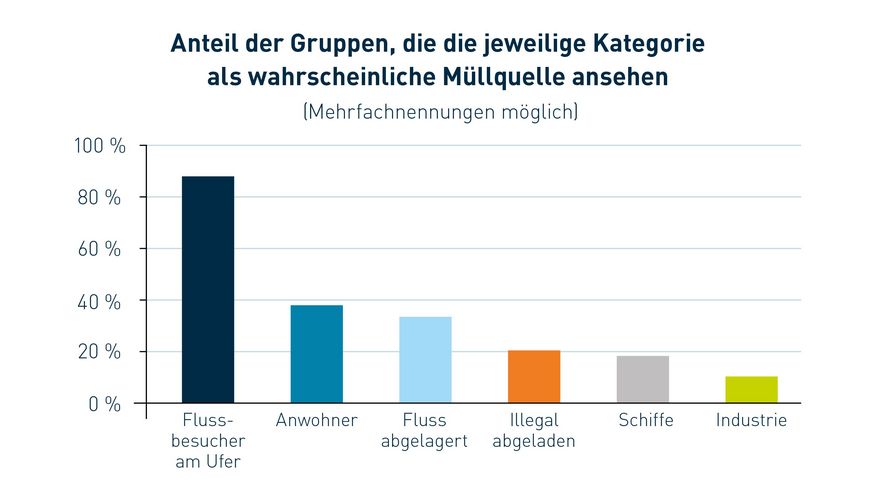 Um die Müllquellen auszumachen, wurden die jungen Forscherinnen und Forscher nach ihren Einschätzungen zu den Ursachen befragt. Laut Plastikpiraten sind es besonders die Flussbesucher der Uferflächen, die den Großteil des Mülls verursachen. Diese Erkenntnis wurde daraus gewonnen, dass in der Böschung am meisten Müll gefunden wurde und dieser hauptsächlich aus Verpackungen, Flaschen, Zigarettenstummeln oder Essensresten besteht. Für diese Auswertung wurden Datensätze von insgesamt 163 Gruppen berücksichtigt, Mehrfachnennungen waren möglich. 88 Prozent vermuteten, dass Flussbesucher eine wahrscheinliche Müllquelle sind. Danach folgen mit 38 Prozent Anwohner, die durch Mülltonnen und -säcke sowie Haushaltsmüll wie Hygieneartikel durch die jungen Forscher entlarvt werden konnten. Weniger häufig wurden Schiffe oder anliegende Industrieanlagen von den Plastikpiraten als Müllquellen genannt.