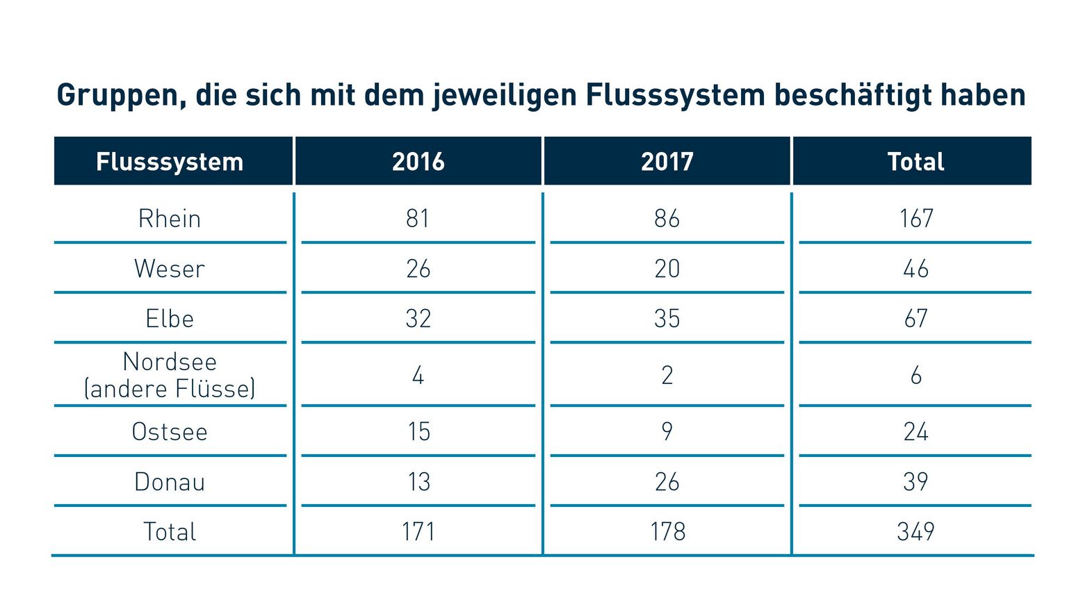 Über 5.500 Jugendliche von mehr als 300 Schulen und Organisationen nahmen in den Jahren 2016 und 2017 an der Aktion „Plastikpiraten“ teil. An verschiedenen Fließgewässern in ganz Deutschland sammelten sie Müll und leisteten somit einen kleinen Beitrag zum Schutz der Meere vor (Plastik-)Müll. Die meisten Gruppen beschäftigten sich mit dem Flusssystem des Rheins, dicht gefolgt von Elbe, Weser und Donau. Aber nicht nur die großen Flüsse wurden untersucht, auch kleinere Fließgewässer wie die Ems und die Schwentine wurden von den Plastikpiraten unter die Lupe genommen. Insgesamt haben im Rahmen der Aktion 376 Gruppen Datensätze zur Verfügung gestellt, von denen 349 erfolgreich validiert werden konnten und in diese Analyse eingeflossen sind.