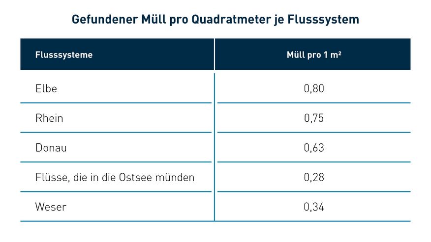 231 Schulen und Organisationen lieferten Datensätze zu größeren Müllteilen, die im Fluss schwammen und sich nicht bereits am Ufer abgesetzt haben. Insgesamt wurden 538 Teile – größtenteils aus Plastik – gefunden, die normalerweise nicht in saubere Fließgewässer gehören. Unter Berücksichtigung der Beobachtungszeit trieben im Durchschnitt etwa 3,02 Müllteile in der Stunde vorbei. Was zunächst nicht nach viel Müll klingt, kann tatsächlich allerdings nur als Mindestmaß betrachtet werden: Besonders große und breite Flüsse konnten durch die Schul- und Jugendgruppen nicht vollständig überblickt werden. Und auch gestauter Müll an Ästen von Bäumen bleibt hier beispielsweise außer Betracht.