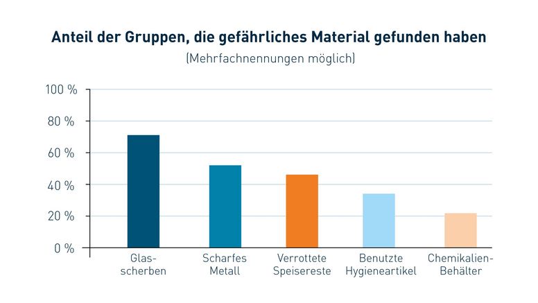 Insgesamt halfen 320 Jugendgruppen dabei, wichtige Daten über gefährliche Materialien – also z. B. Glasscherben, scharfes Metall, Chemikalien oder Hygieneartikel – am Flussufer zu sammeln. Ganze 89 Prozent dieser Gruppen fanden Material mindestens einer gefährlichen Kategorie auf ihrer Jagd nach Plastik. Mehr als zwei Drittel – 69 Prozent – entdeckten sogar Materialien, die zwei oder mehr Gefahrengruppen angehören. Aber wie viele gefährliche Funde konnten die Plastikpiraten tatsächlich in den jeweiligen Kategorien der Gefahrenmaterialien ausmachen?