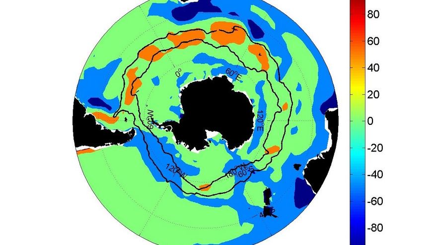 The ocean never stops to surprise me though. Recent work suggests that superimposed on the basic scheme mentioned above, there is a Southern / Northern Hemisphere transport of heat in the ocean with, at its source, a mighty set of ocean currents around Antarctica (the Antarctic Circumpolar Current or ACC for short). The core of this current is being heated, with an average intensity of about 30 Wm-2 which, averaged over the overall extent of the current, amounts to about 0.5 PW (see Figure). To put this number into context, this amounts to about half the heat carried by the Gulf Stream (1PW = 10^15 W), so it is a lot.