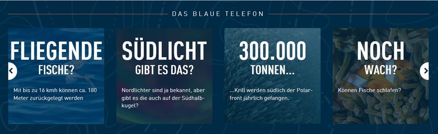 Unter den Nachrichten stehen die neuesten Fragen und Antworten vom „Blauen Telefon“. Zum Beispiel: Wie weit können Fische fliegen?