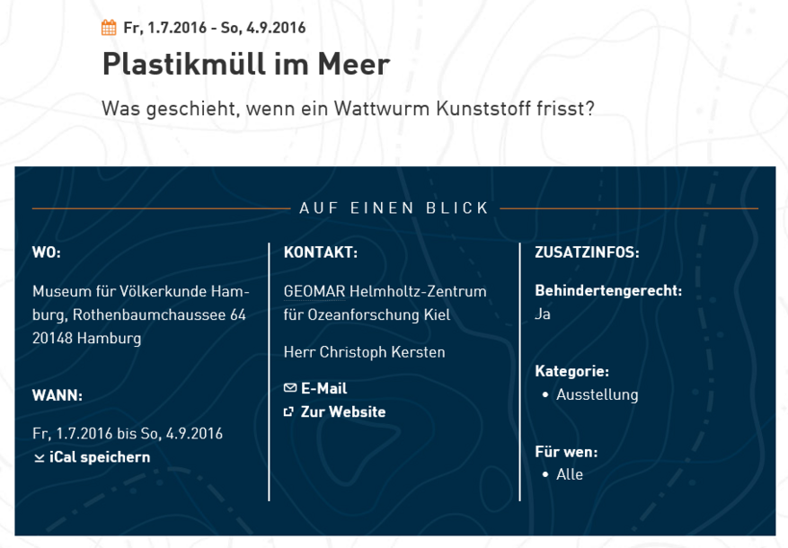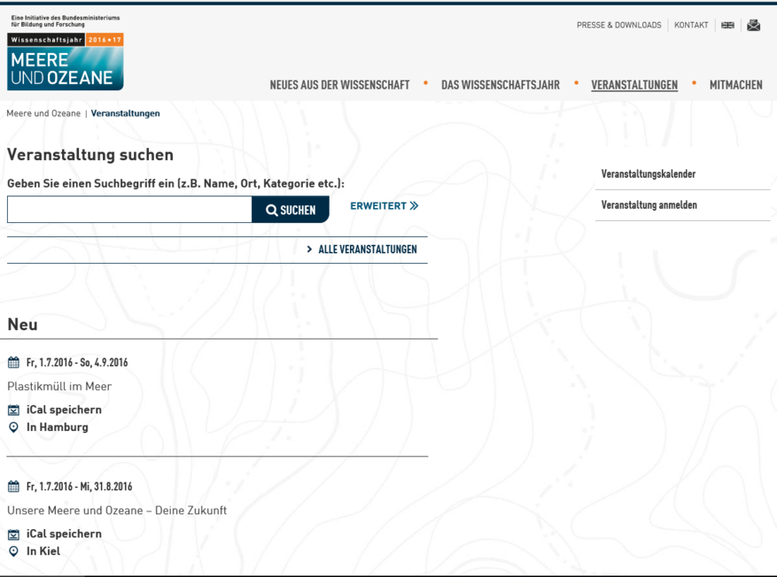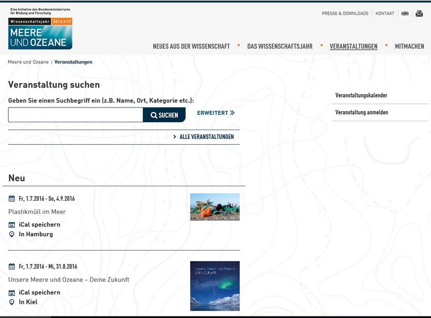 Vielleicht wollen Sie selber mal eine Veranstaltung zum Thema „Meere und Ozeane“ machen. Dann können Sie die Veranstaltung bei uns anmelden.