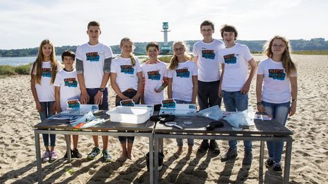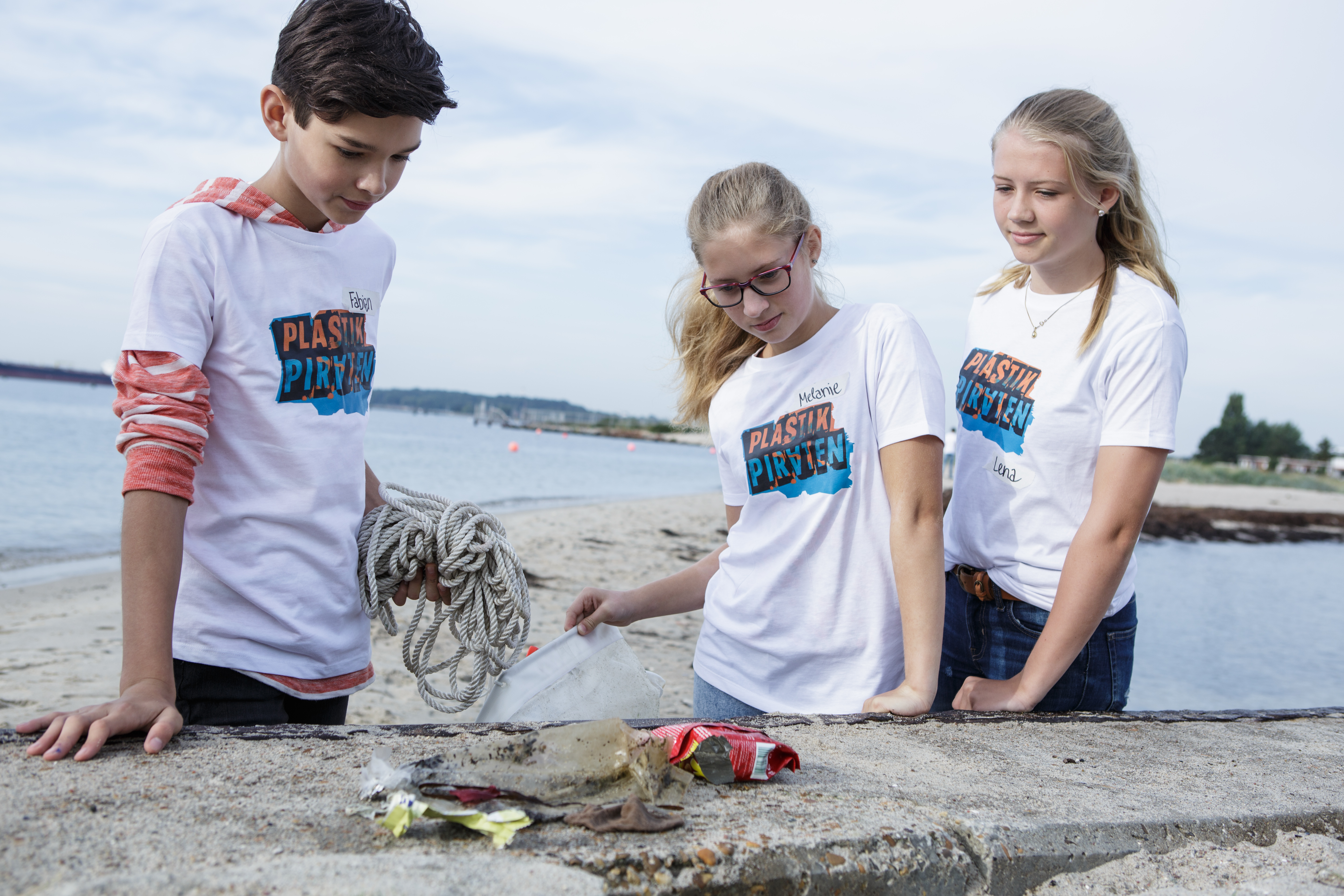 Fabian Stiller, Melanie Baasch und Lena Weiß vom Friedrich-Schiller-Gymnasium Preetz nehmen bei der Jugendaktion „Plastikpiraten – Das Meer beginnt hier!“ im Wissenschaftsjahr 2016*17 – Meere und Ozeane die ersten Plastikproben an der Kieler Förde.