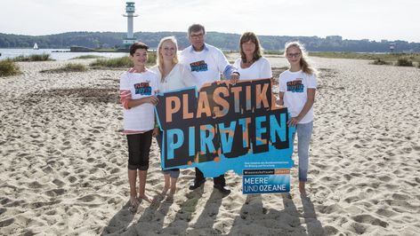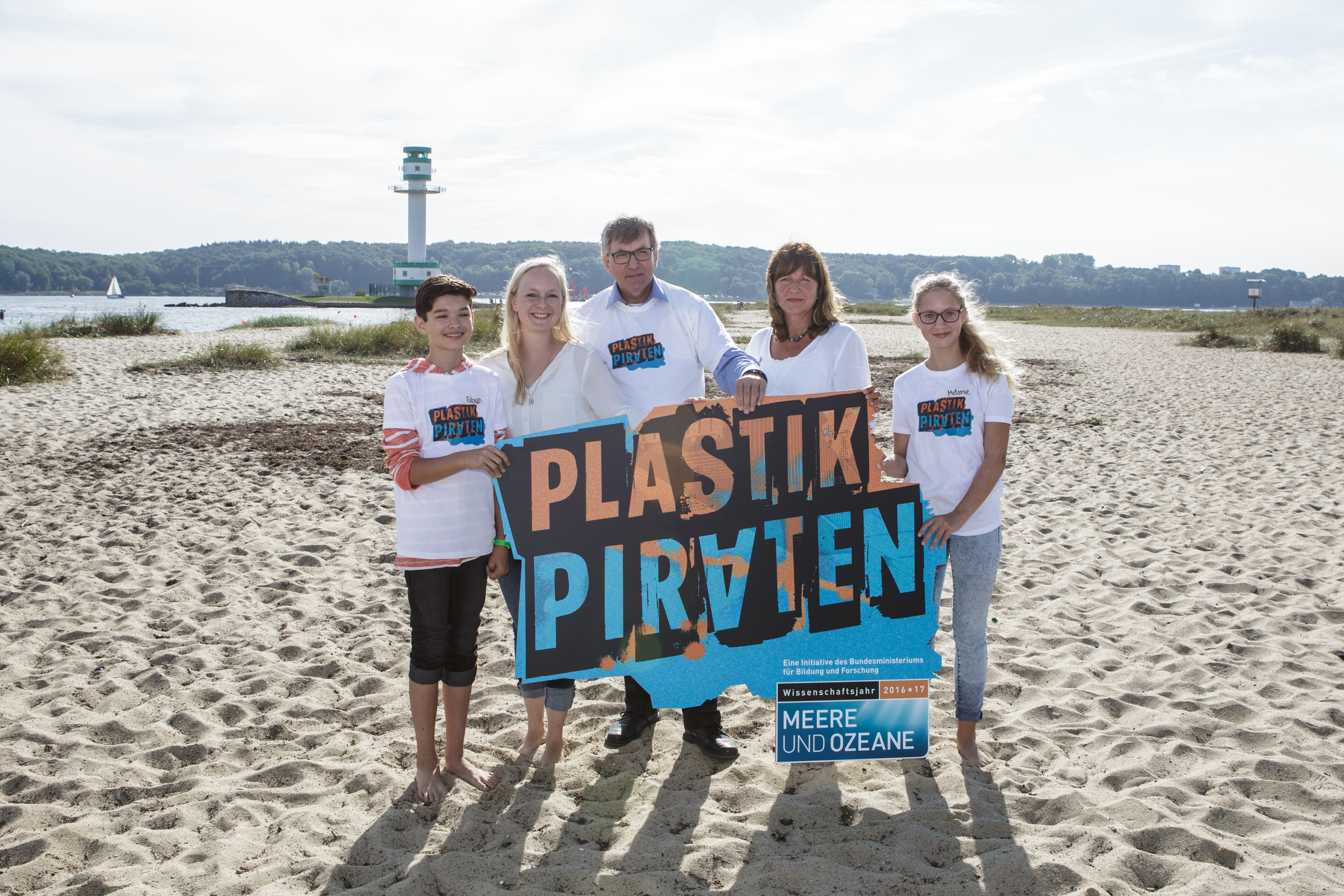 Lehrerin Kristine Pape vom Friedrich-Schiller-Gymnasium Preetz, Wilfried Kraus, Ministerialdirigent im Bundesministerium für Bildung und Forschung, Dr. Katrin Knickmeier von der Kieler Forschungswerkstatt zwischen den Schülern Fabian Stiller und Melanie Baasch beim Start der Jugendaktion „Plastikpiraten“ im Wissenschaftsjahr 2016*17 – Meere und Ozeane.