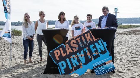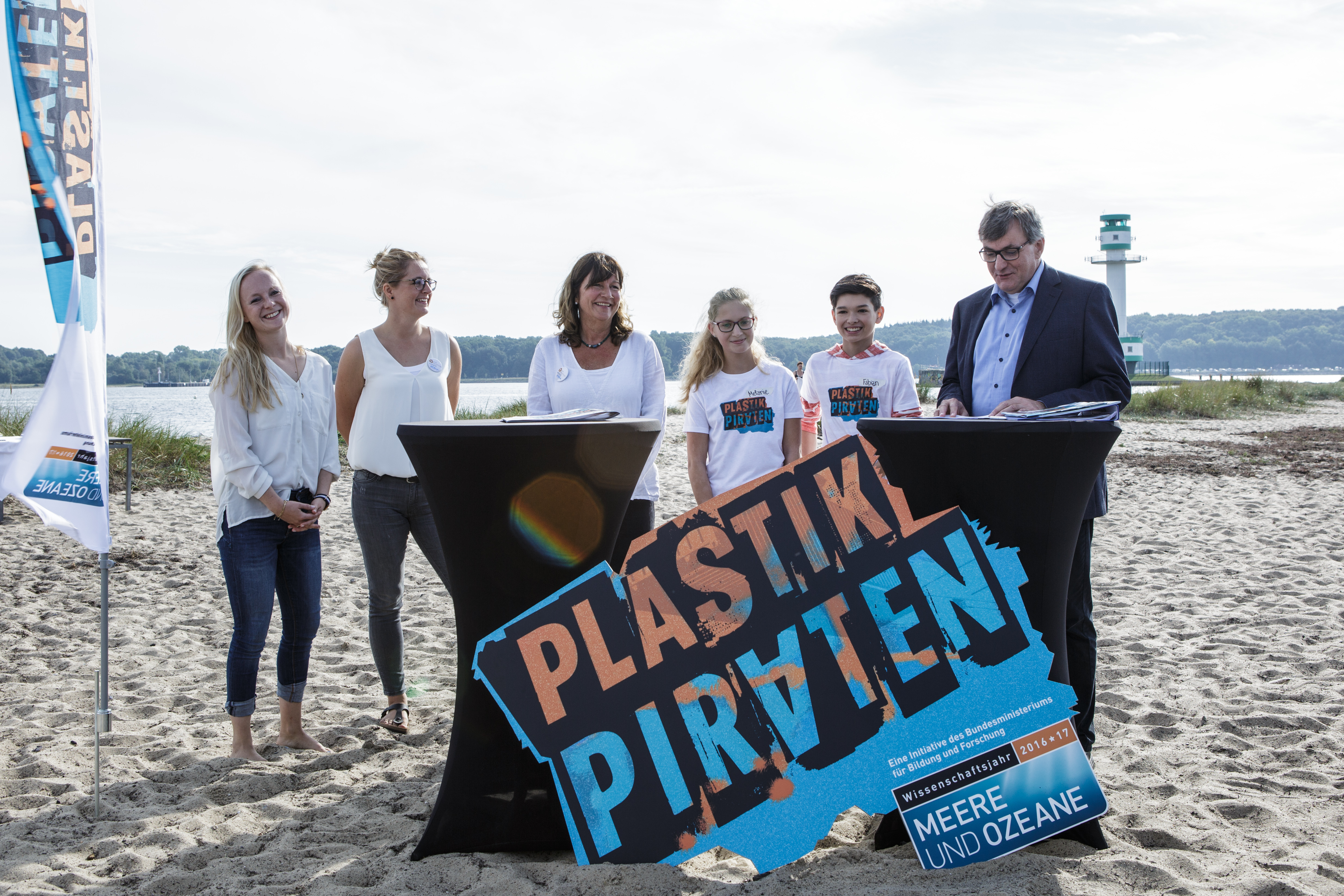 Pressegespräch zum Start der Jugendaktion „Plastikpiraten – Das Meer beginnt hier!“ im Wissenschaftsjahr 2016*17 – Meere und Ozeane: Lehrerin Kristine Pape vom Friedrich-Schiller-Gymnasiums Preetz, Katrin Kruse und Dr. Katrin Knickmeier von der Kieler Forschungswerkstatt, die Schüler Melanie Baasch und Fabian Stiller sowie Wilfried Kraus, Ministerialdirigent im Bundesministerium für Bildung und Forschung.