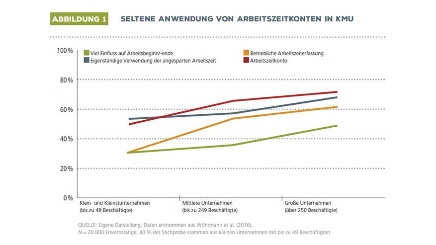 Bisher stehen den Beschäftigten dieser Betriebe jedoch im Allgemeinen weniger Arbeitszeitkonten oder Gleitzeitmodelle zur Verfügung als denen größerer Unternehmen. Das zeigt eine Studie des Fraunhofer-Instituts für Arbeitswirtschaft und Organisation (IAO) in Berlin. Die Gründe dafür lägen unter anderem auf organisatorischer und rechtlicher Ebene; sie hingen zudem mit der Unternehmens- und Führungskultur zusammen, die sich oft stark von der in größeren Firmen unterscheide.