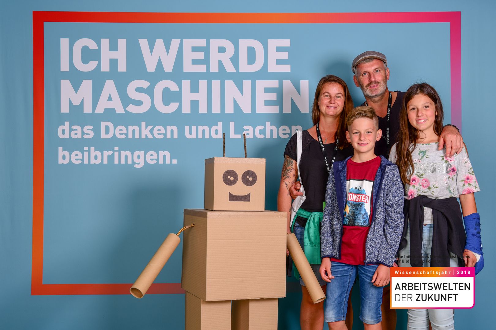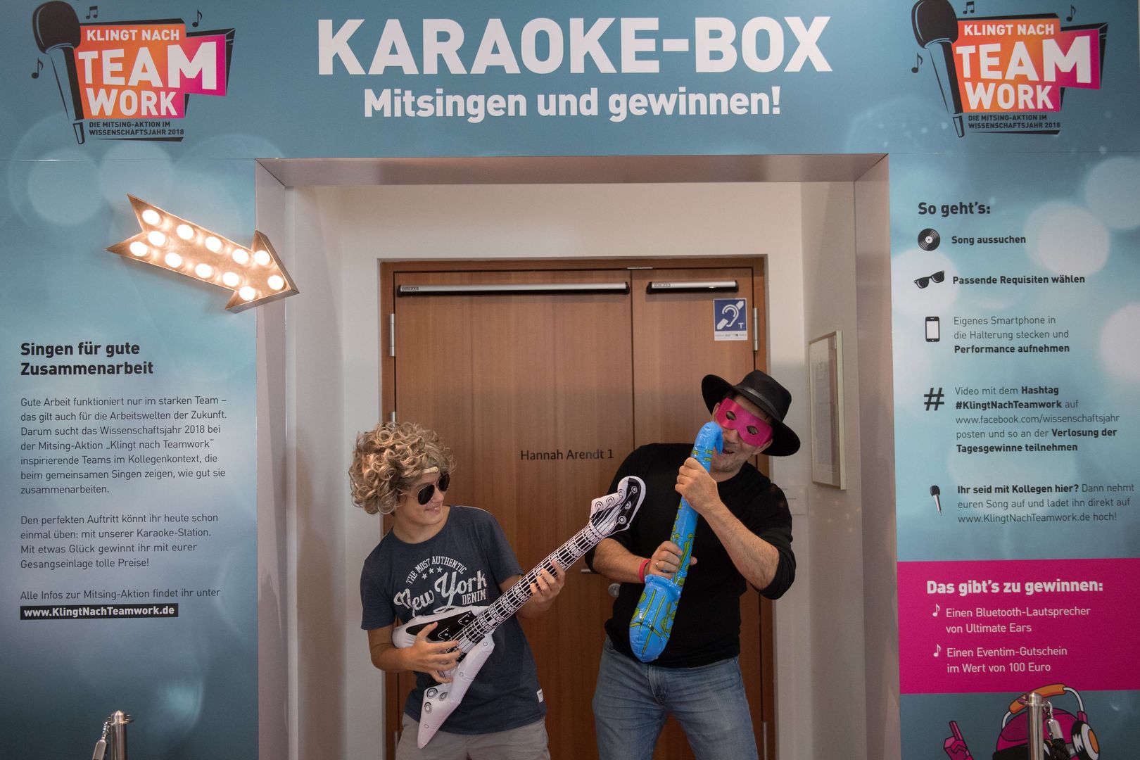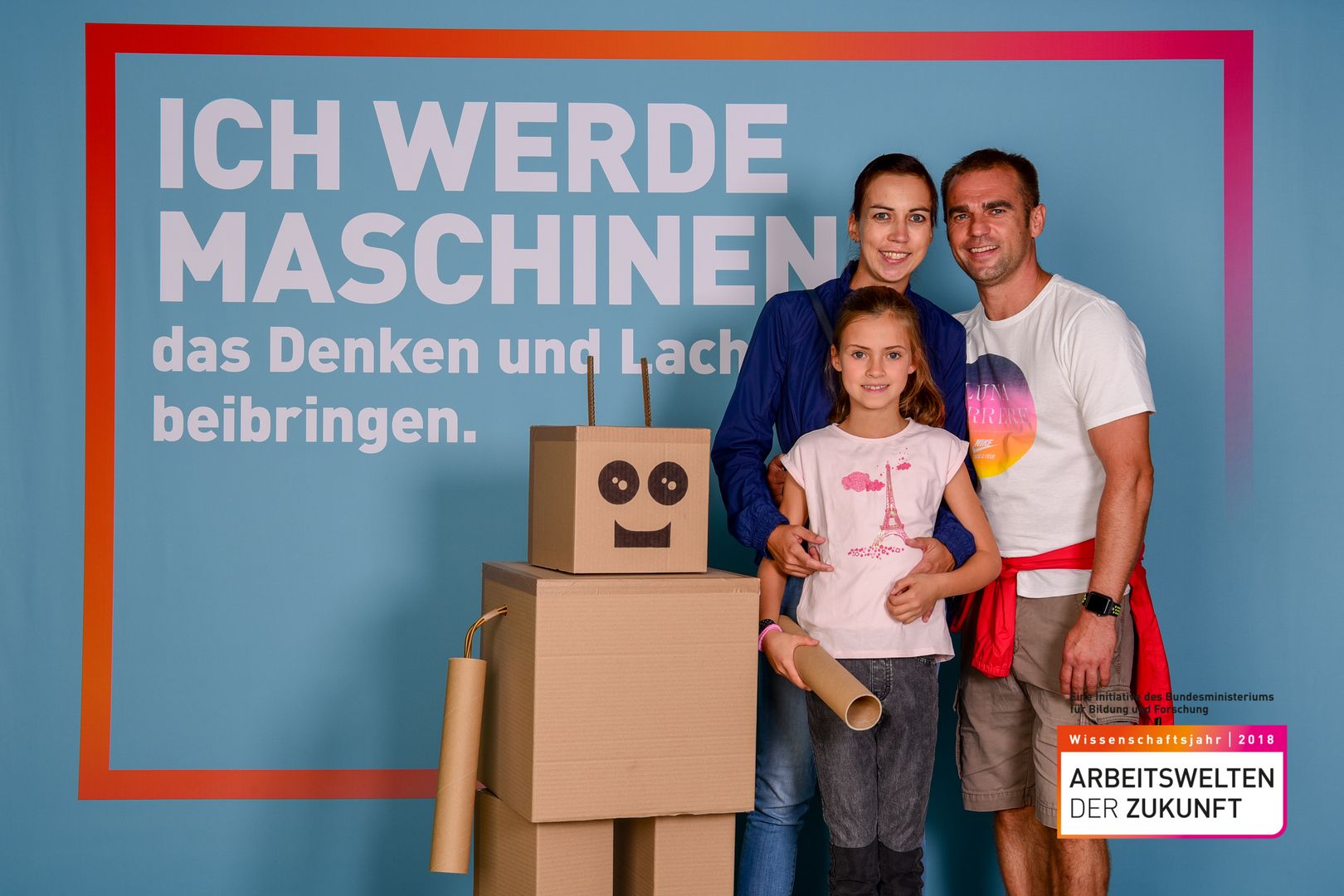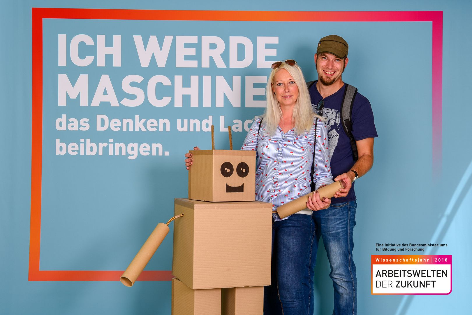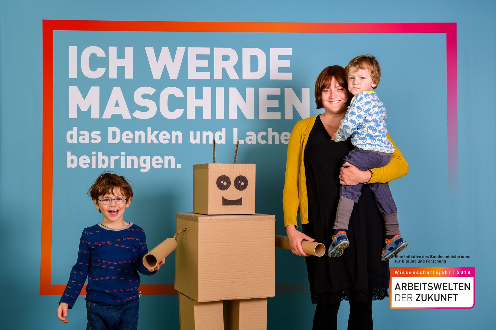 Auch das Wissenschaftsjahr 2018 war vor Ort und bot spannende Einblicke in die Arbeitswelten der Zukunft. Ob beim Kistenstapeln mithilfe einer Datenbrille oder bei der Erstellung eines digitalen Jobprofils von der Künstliche-Intelligenz-Berufs-Agentur (KIBA) – die Besucherinnen und Besucher konnten im BMBF schon heute erleben, wie wir in Zukunft arbeiten werden. Vor allem die beiden interaktiven Roboter Emma und Robbie zogen viele Blicke auf sich – sie sollen in Zukunft die Fachkräfte in der Altenpflege entlasten. Mit der Karaoke-Station der Mitsing-Aktion „Klingt nach Teamwork“ kam auch der Spaß nicht zu kurz.
