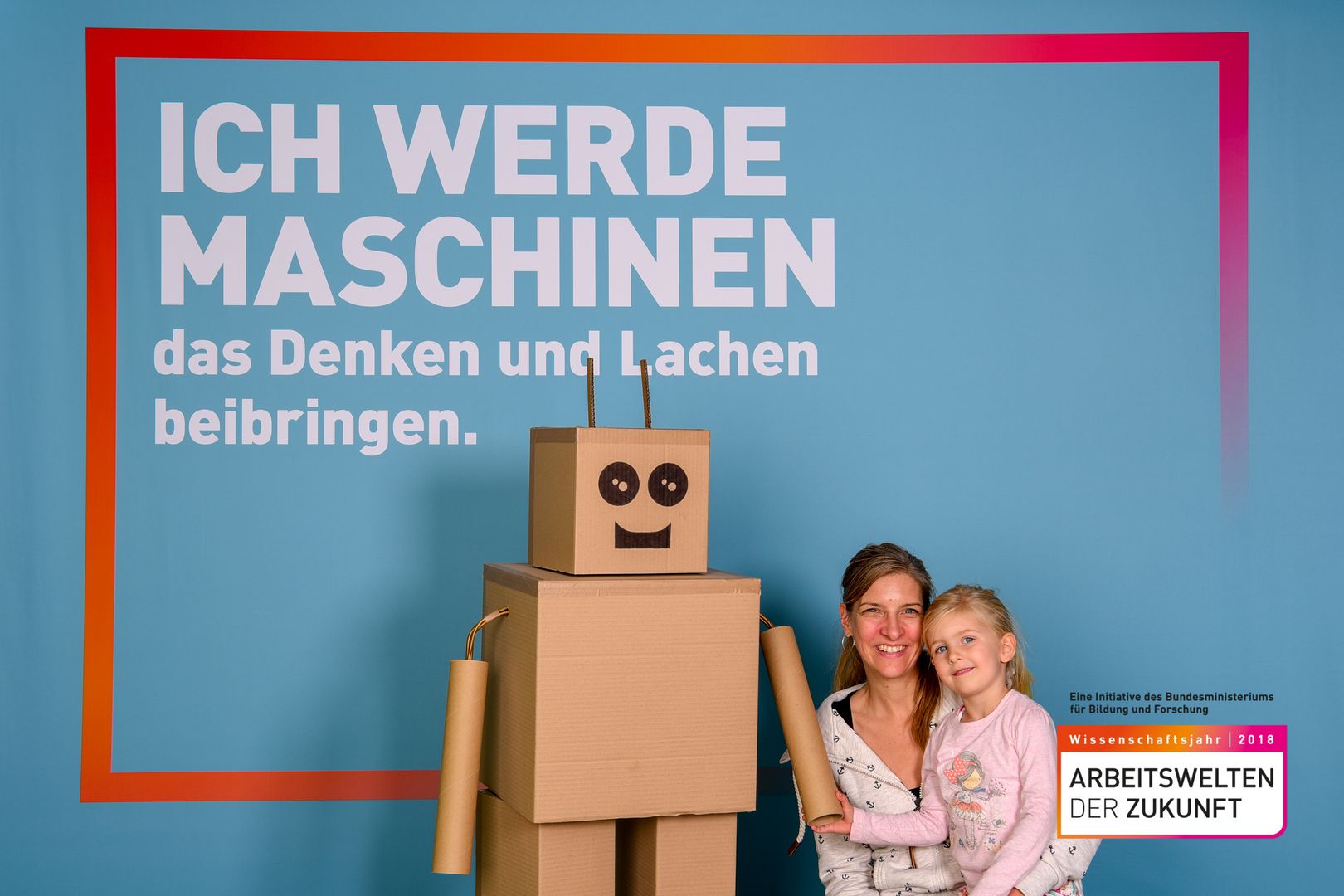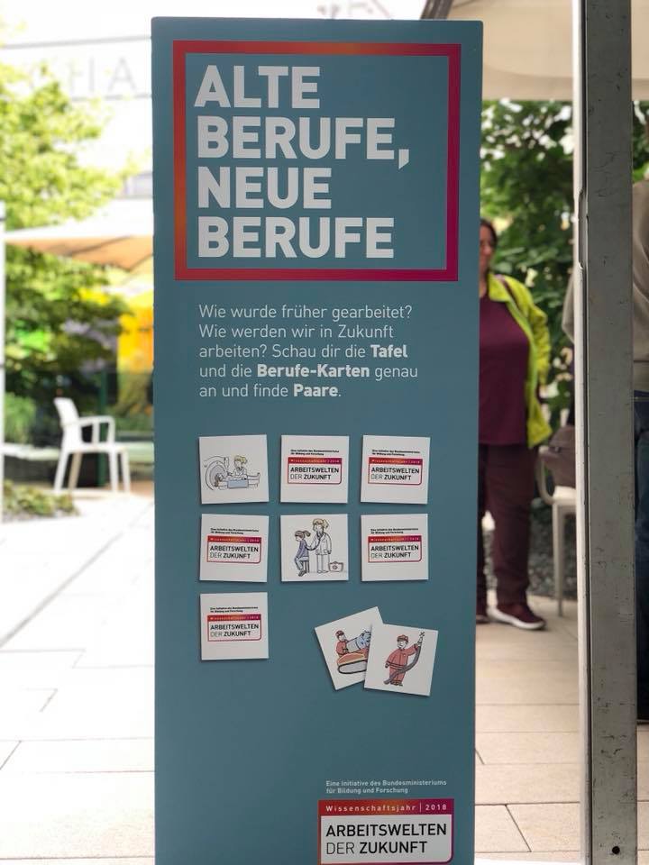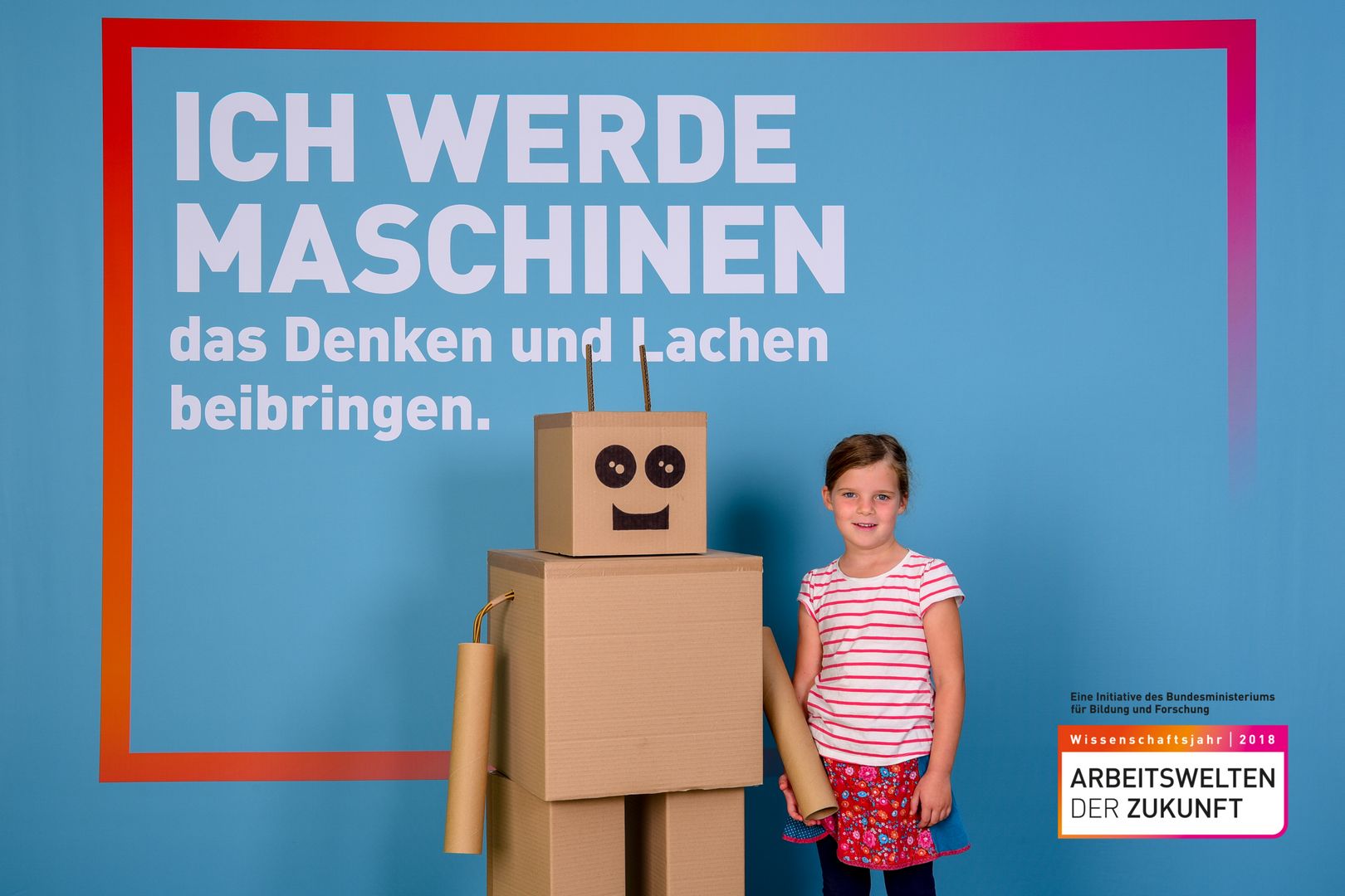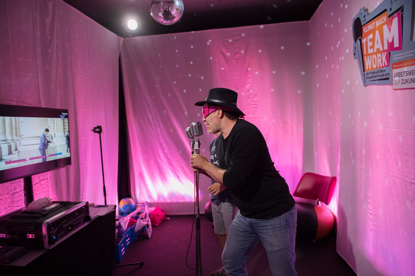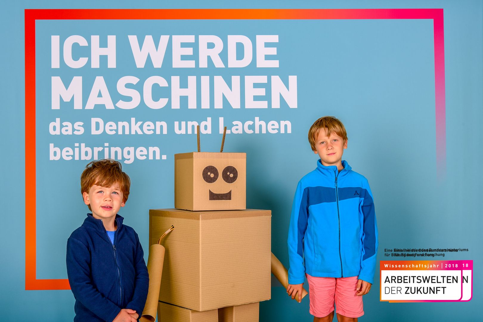 Auch das Wissenschaftsjahr 2018 war vor Ort und bot spannende Einblicke in die Arbeitswelten der Zukunft. Ob beim Kistenstapeln mithilfe einer Datenbrille oder bei der Erstellung eines digitalen Jobprofils von der Künstliche-Intelligenz-Berufs-Agentur (KIBA) – die Besucherinnen und Besucher konnten im BMBF schon heute erleben, wie wir in Zukunft arbeiten werden. Vor allem die beiden interaktiven Roboter Emma und Robbie zogen viele Blicke auf sich – sie sollen in Zukunft die Fachkräfte in der Altenpflege entlasten. Mit der Karaoke-Station der Mitsing-Aktion „Klingt nach Teamwork“ kam auch der Spaß nicht zu kurz.