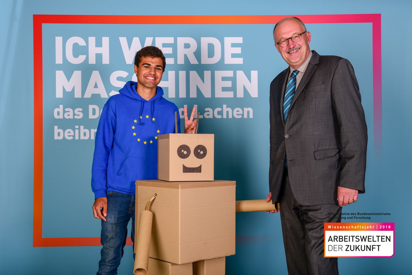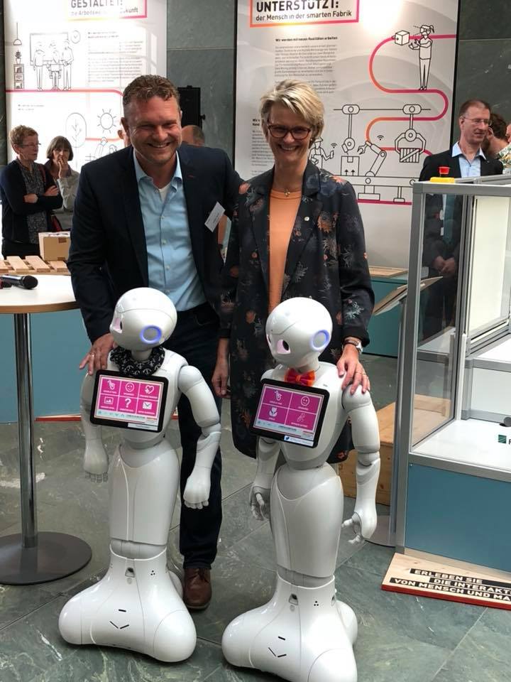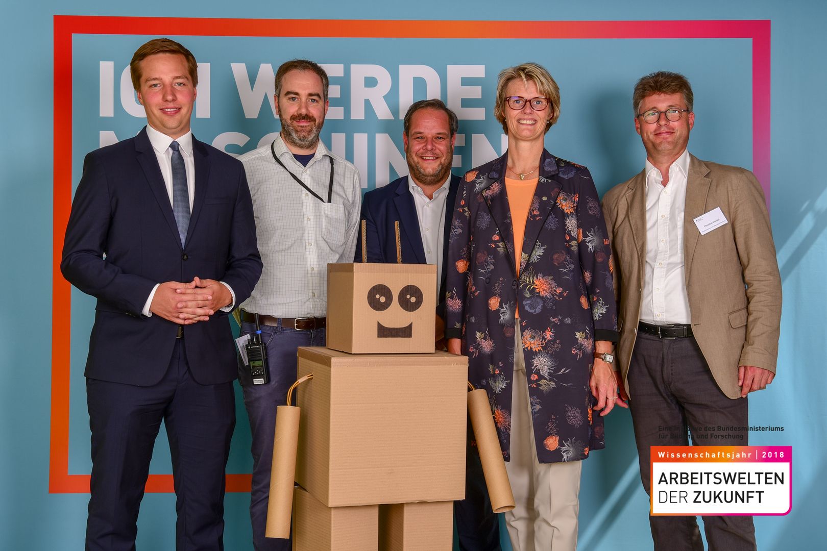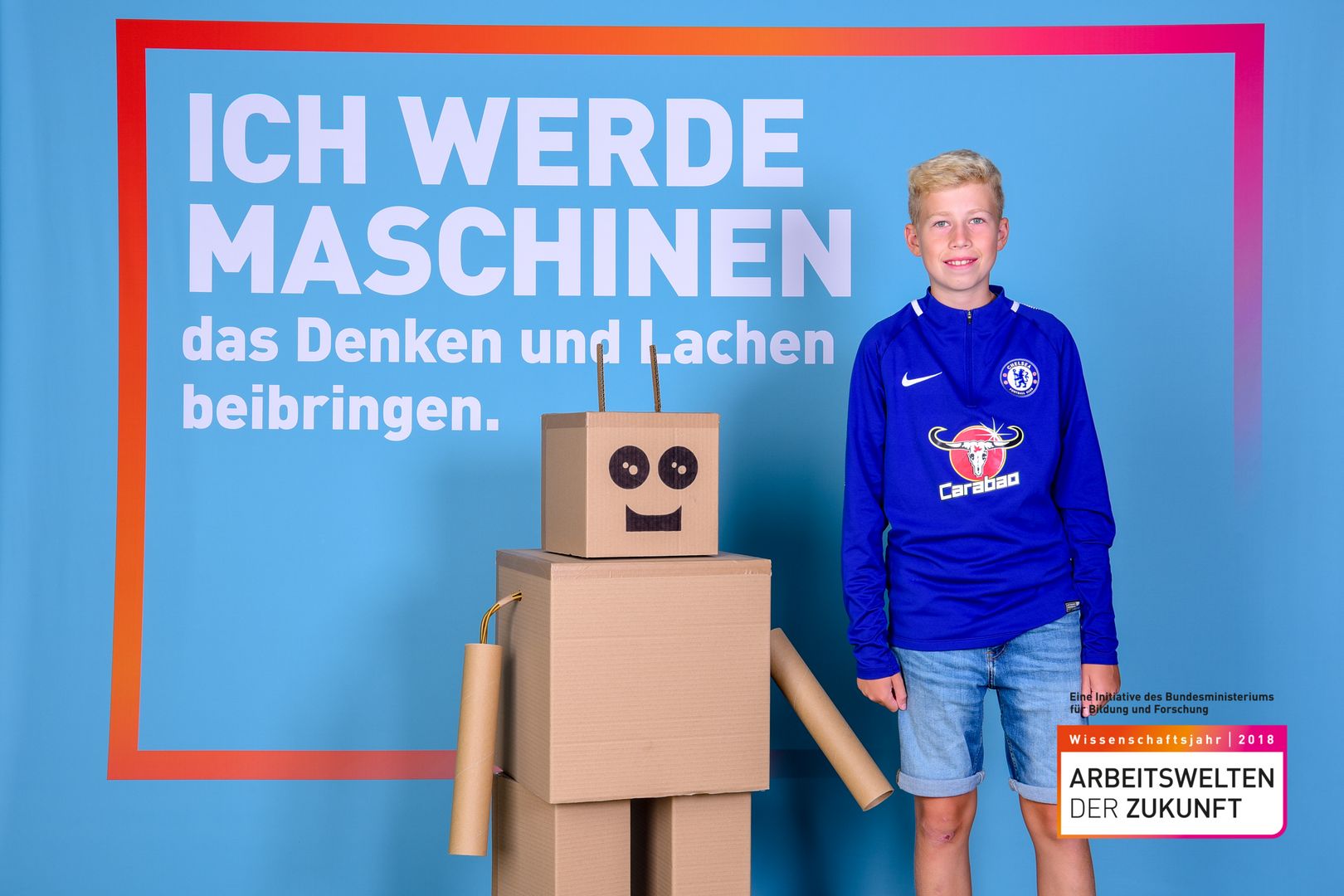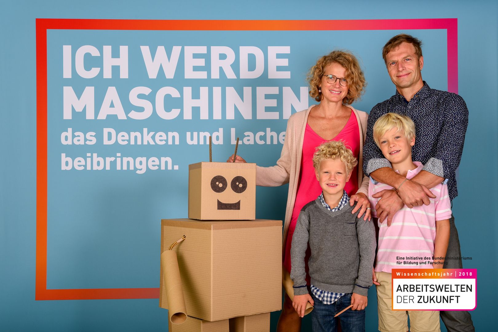 Auch das Wissenschaftsjahr 2018 war vor Ort und bot spannende Einblicke in die Arbeitswelten der Zukunft. Ob beim Kistenstapeln mithilfe einer Datenbrille oder bei der Erstellung eines digitalen Jobprofils von der Künstliche-Intelligenz-Berufs-Agentur (KIBA) – die Besucherinnen und Besucher konnten im BMBF schon heute erleben, wie wir in Zukunft arbeiten werden. Vor allem die beiden interaktiven Roboter Emma und Robbie zogen viele Blicke auf sich – sie sollen in Zukunft die Fachkräfte in der Altenpflege entlasten. Mit der Karaoke-Station der Mitsing-Aktion „Klingt nach Teamwork“ kam auch der Spaß nicht zu kurz.