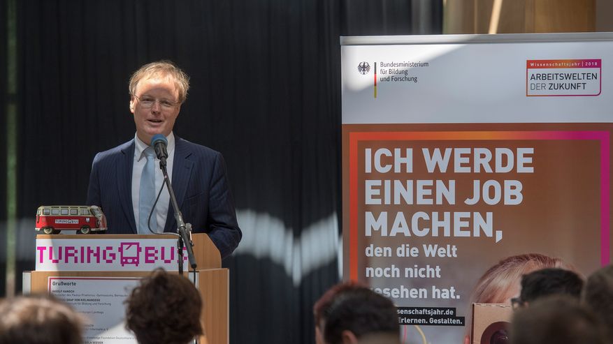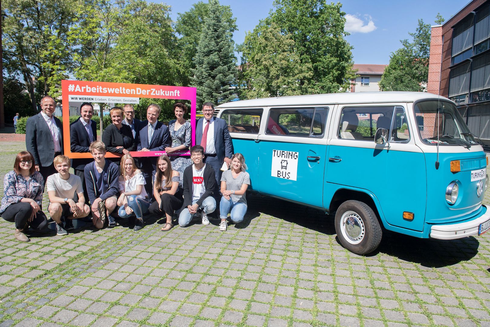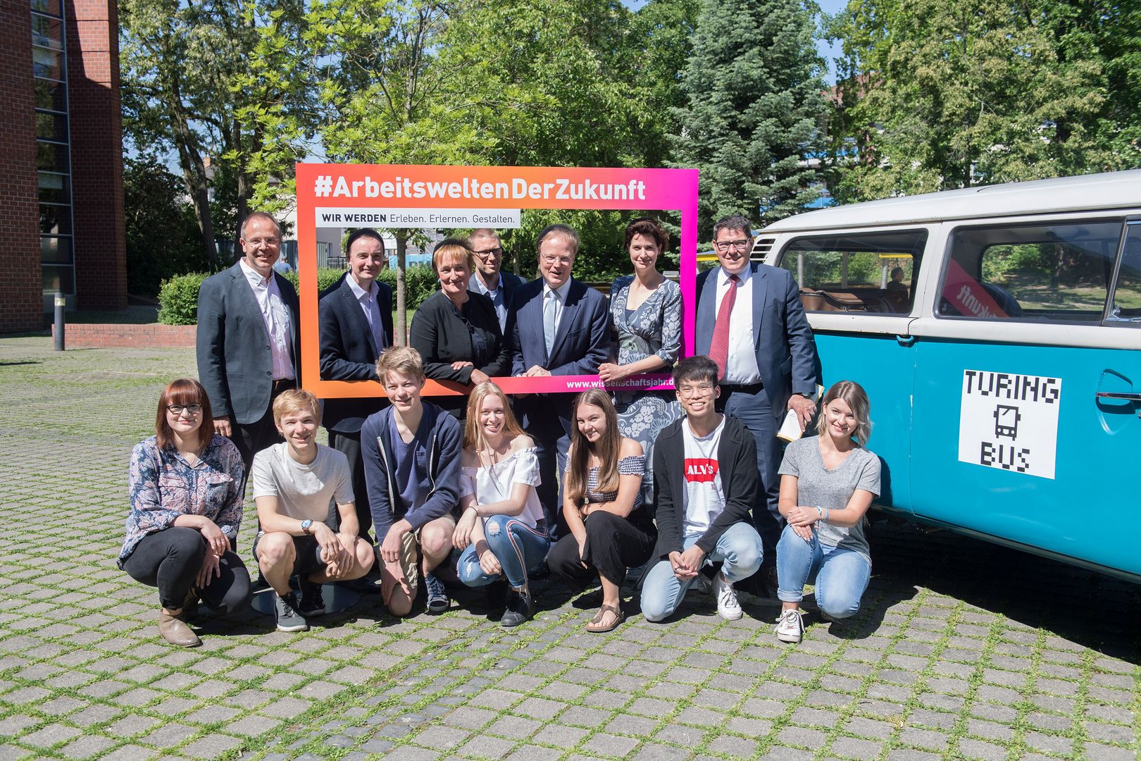 Eines der Kern-Ziele: Jugendlichen und jungen Erwachsenen in ländlichen Regionen kostenlos Möglichkeiten aufzeigen, die die Digitalisierung in den Arbeitswelten der Zukunft bietet. „Mit dem Turing-Bus lernen Jugendliche und junge Erwachsene, wie sie die Arbeitswelten der Zukunft selbst mitgestalten können“, sagte Matthias Graf von Kielmansegg, Leiter der Abteilung „Grundsatzfragen; Strategie; Digitaler Wandel“ im Bundesministerium für Bildung und Forschung (BMBF). „Dabei werden die Arbeitswelten immer aus verschiedenen Perspektiven betrachtet, von der Informatik über die Ingenieurs- bis zu den Geisteswissenschaften.“