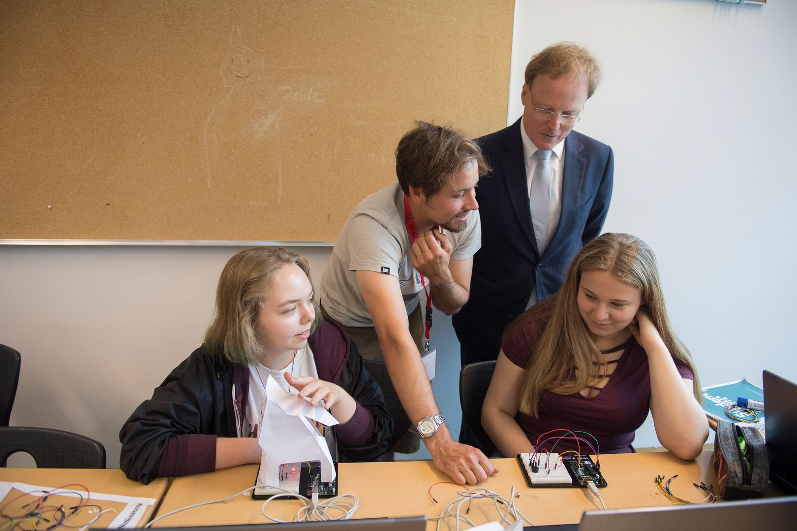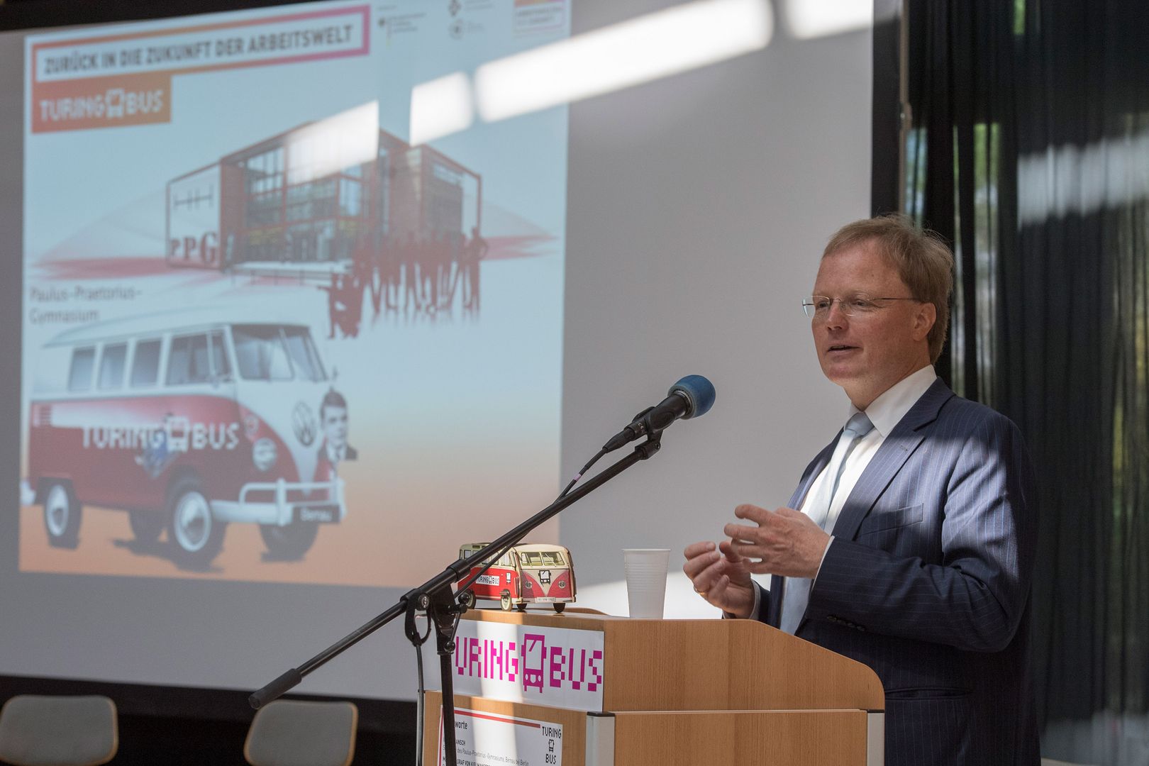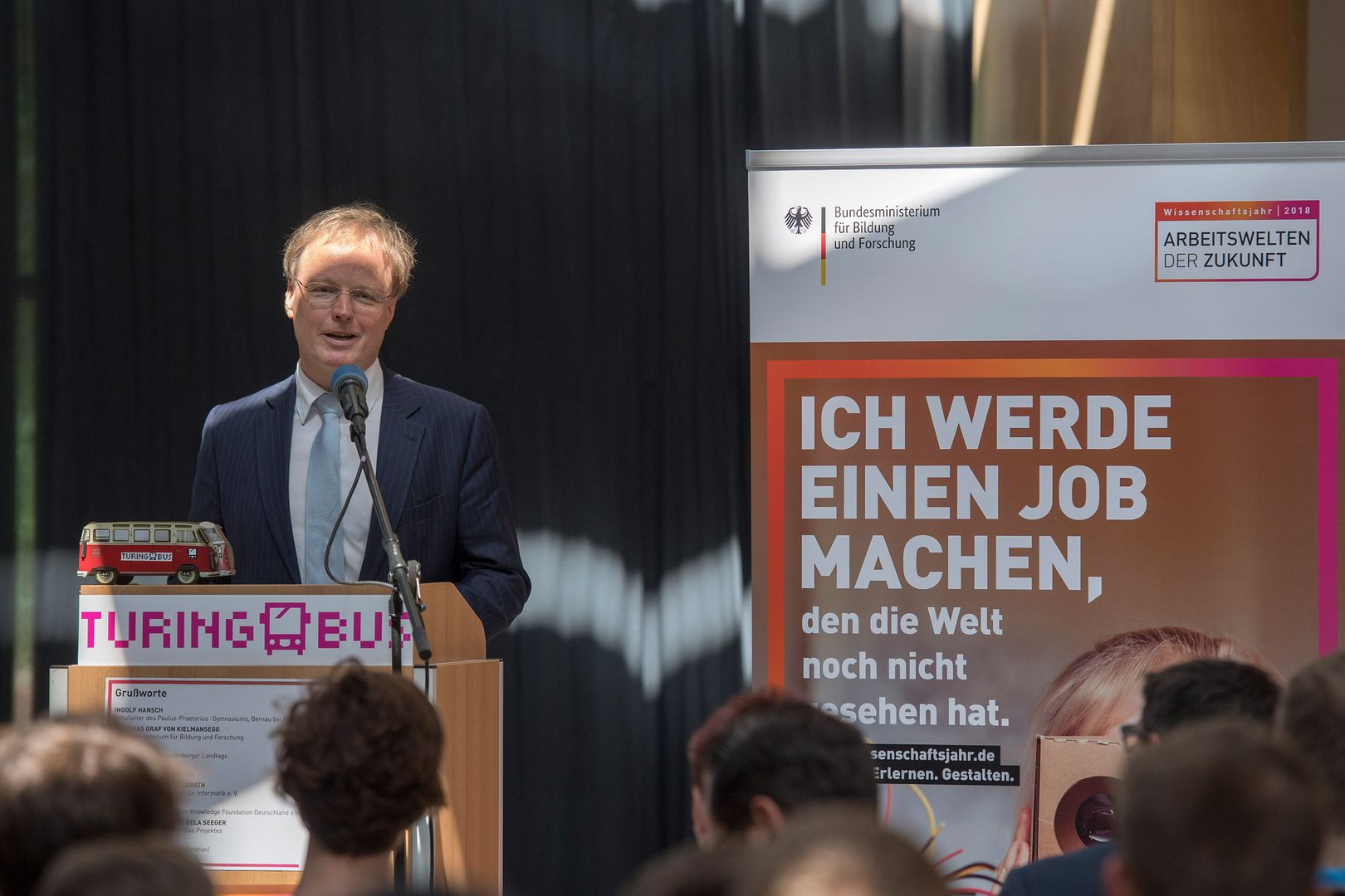 Eines der Kern-Ziele: Jugendlichen und jungen Erwachsenen in ländlichen Regionen kostenlos Möglichkeiten aufzeigen, die die Digitalisierung in den Arbeitswelten der Zukunft bietet. „Mit dem Turing-Bus lernen Jugendliche und junge Erwachsene, wie sie die Arbeitswelten der Zukunft selbst mitgestalten können“, sagte Matthias Graf von Kielmansegg, Leiter der Abteilung „Grundsatzfragen; Strategie; Digitaler Wandel“ im Bundesministerium für Bildung und Forschung (BMBF). „Dabei werden die Arbeitswelten immer aus verschiedenen Perspektiven betrachtet, von der Informatik über die Ingenieurs- bis zu den Geisteswissenschaften.“