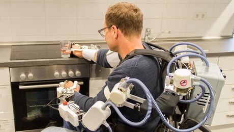 Hier setzt die Rehabilitationsrobotik an. Gemeinsam mit der rehaworks GmbH entwickelte das Deutsche Forschungszentrum für Künstliche Intelligenz (DFKI) ein mobiles Exoskelett für die Oberkörperassistenz speziell zur robotergestützten Therapie nach einem Schlaganfall.