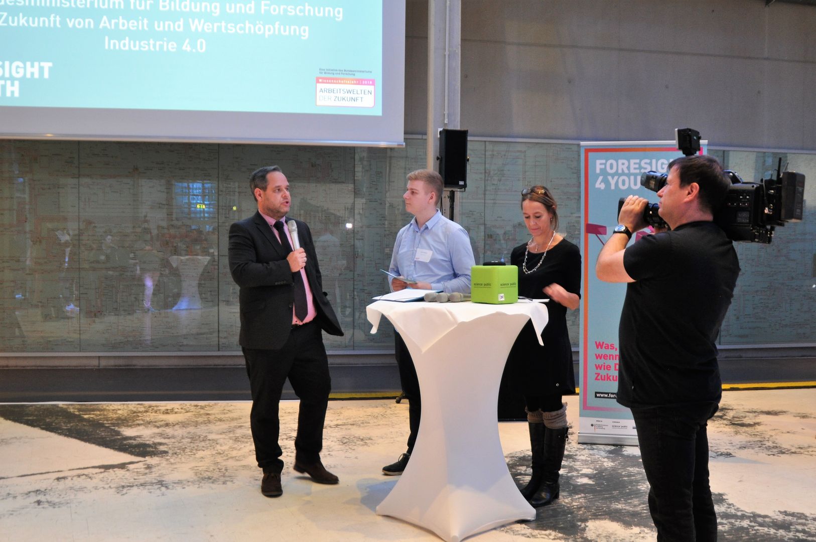 Im Mittelpunkt standen dabei natürlich die entstanden Werke sowie Film- und Musikvorführungen der Jugendlichen. Hierzu übernahm YouTuber Dr. Whatson die Veranstaltungsmoderation und kitzelte im Gespräch Hintergründe zu kreativen Ansätzen, Interessen sowie Wissenswertes zur Entstehung der Exponate heraus. Die Kreativbeiträge deckten dabei unterschiedlichste Blickwinkel auf die Arbeitswelten der Zukunft ab. Das Spektrum reichte dabei von Rapsongs zur Zukunft der Arbeit über Fotoinstallationen, Ausstellungsbauten und Siebdruckplatten bis hin zu Videoinstallationen, in denen die Jugendlichen konkrete Herausforderungen in ihren Ausbildungs- und Arbeitswelten schilderten. Besonders spannend waren die Berichte der Jugendlichen über ihre Erfahrungen aus den Werkstätten des Foresight4Youth!-Projekts. Neben einer Reflexion der eigenen Situation, eröffnete sich den Jugendlichen die Möglichkeit eigene Vorstellungen, Fähigkeiten und Stärken herauszuarbeiten und sich dabei selbst zu verwirklichen.
