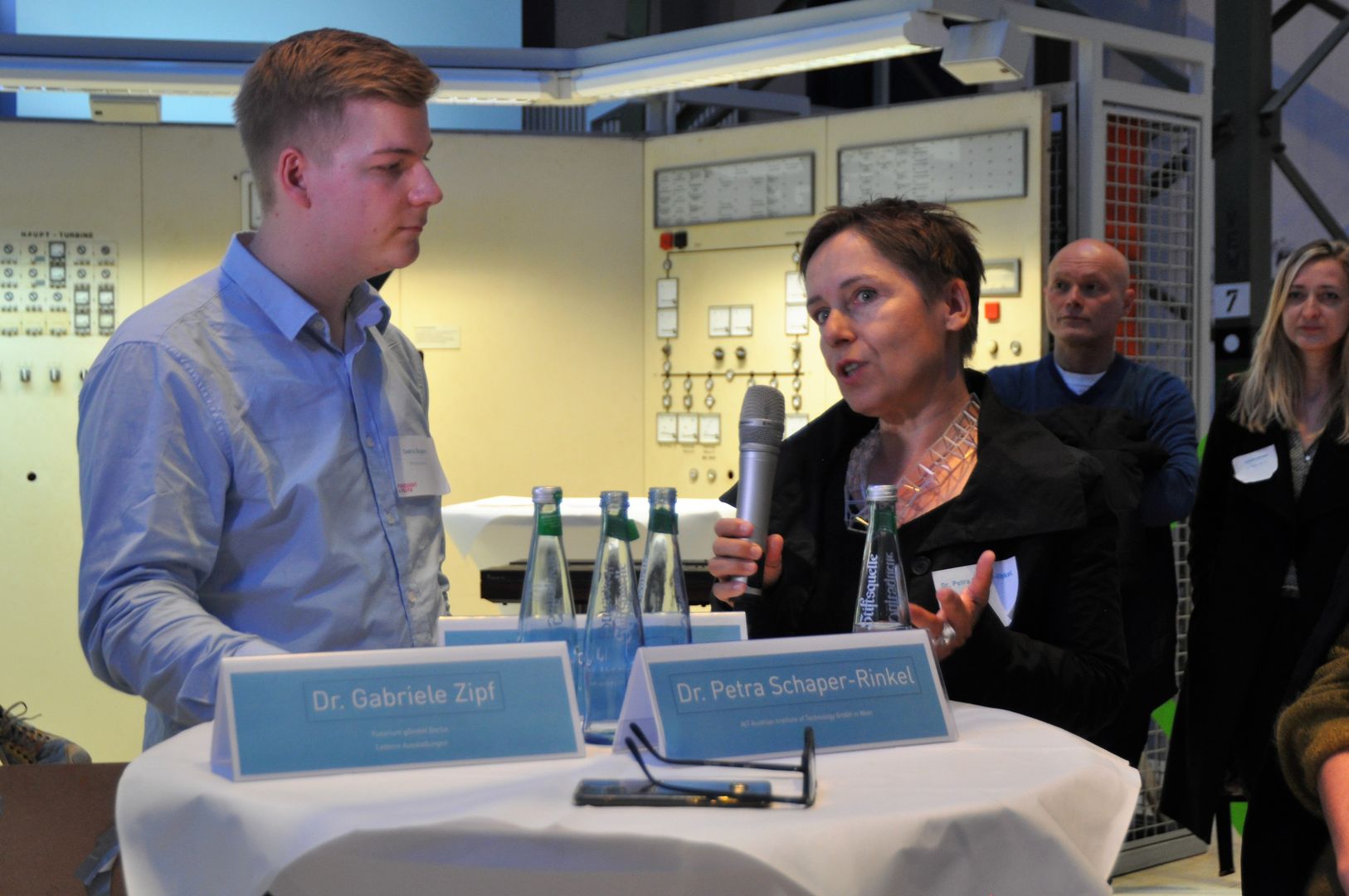 Ergänzt wurde das Programm durch Gespräche mit den Expertinnen und Experten Dr. Petra Schaper-Rinkel, Dr. Gabriele Zipf, Dr. Nicole Marmé, Dr. Jens-Peter Knemeyer und Philipp Schrögel vom KIT. In einem abschließenden Podiumsgespräch diskutierten Tom Wünsche (BMBF), Ilka Maag vom Ministerium für Arbeit und Soziales Nordrhein-Westfalen und Sandra Fitzen aus dem Regionalen Bildungsbüro Dortmund gemeinsam mit Maria Frebel, Pia Thun, Pia Wieczorrek, die aktuell in Berufsorientierungsprogrammen der Caritas Dortmund und der dobeq eingebunden sind. Die dabei gewonnenen Eindrücke und geschilderten Positionen schärften den Blick für die Herausforderungen und Wünsche Jugendlicher in der Arbeitswelt von morgen.