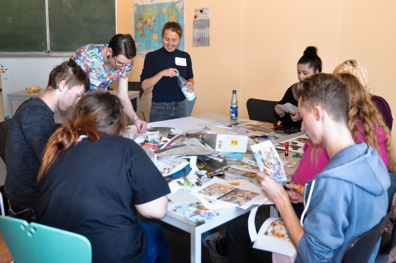 Im Fotografieworkshop wurden die Teilnehmer*innen zu einem Teil ihres eigenen Kunstwerkes. Zuvor erstellte Collagen, die die Wünsche der Teilnehmerinnen für Ihre Arbeitswelt veranschaulichen, wurden auf eine weiße Fläche projiziert. Indem sich die Jugendlichen zwischen die Fläche und den Beamer stellten, wurden auch sie Teil der Collage.