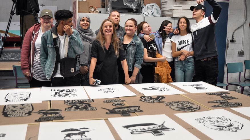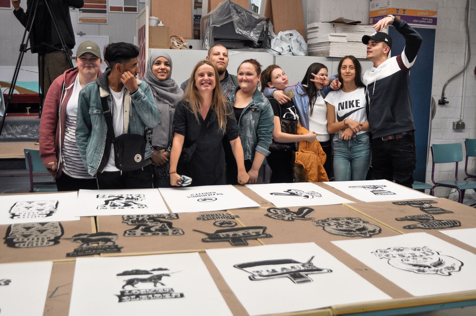 Die Teilnehmer*innen des T-Shirt-Druck Workshops entwarfen durch das Zusammenspiel von Schrift und Bild eigene Slogans rund um das Thema Arbeitswelten der Zukunft. Die hieraus entstandenen Motive werden für die Abschlussveranstaltung auf 80 T-Shirts gedruckt und an die Jugendlichen verteilt.