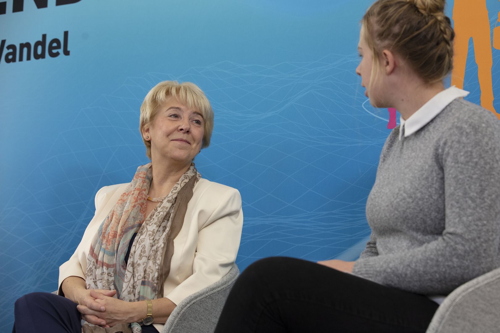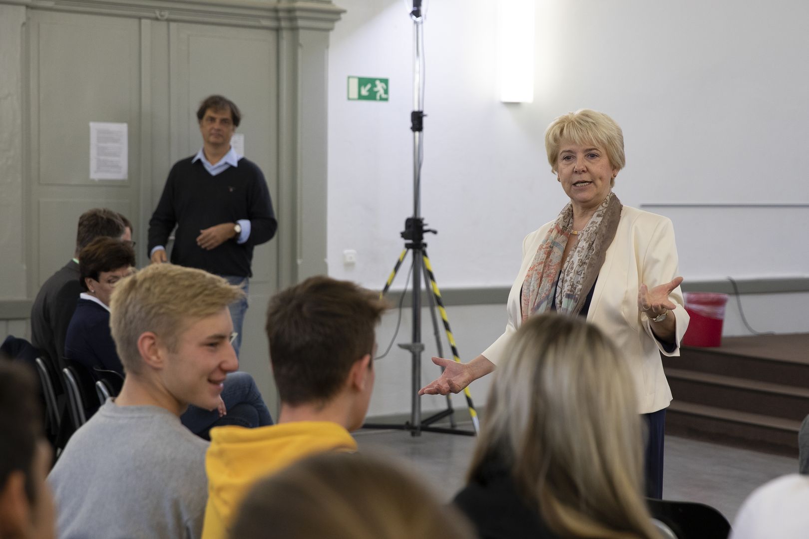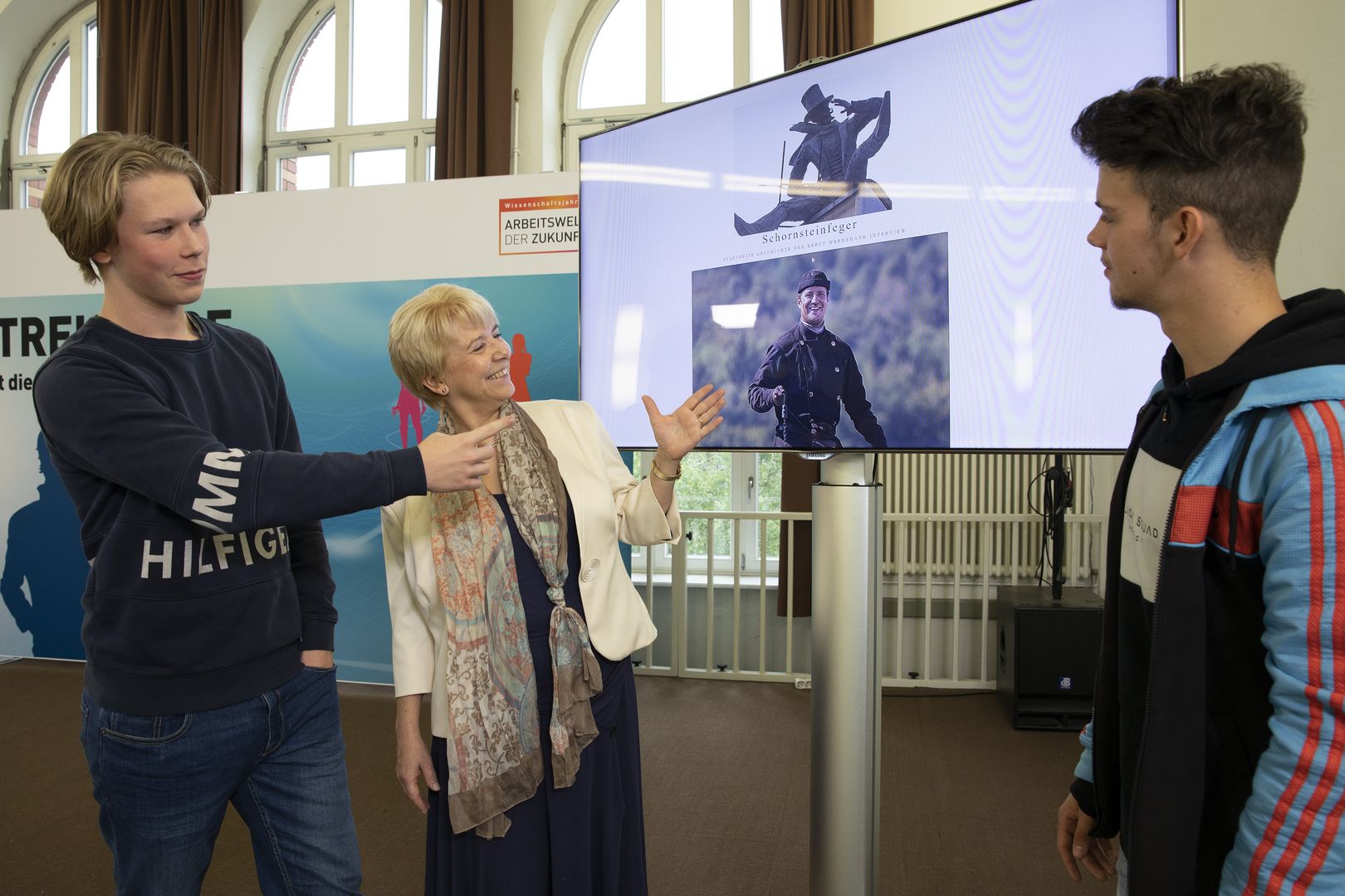 Im Rahmen der Präsentation des Wettbewerbsbeitrags diskutierte Kornelia Haugg, Leiterin der Abteilung 3 „Berufliche Bildung: Lebenslanges Lernen“ im Bundesministerium für Bildung und Forschung (BMBF), mit Lehrkräften sowie den Schülerinnen und Schülern über die aktuellen Herausforderungen der beruflichen Bildung.