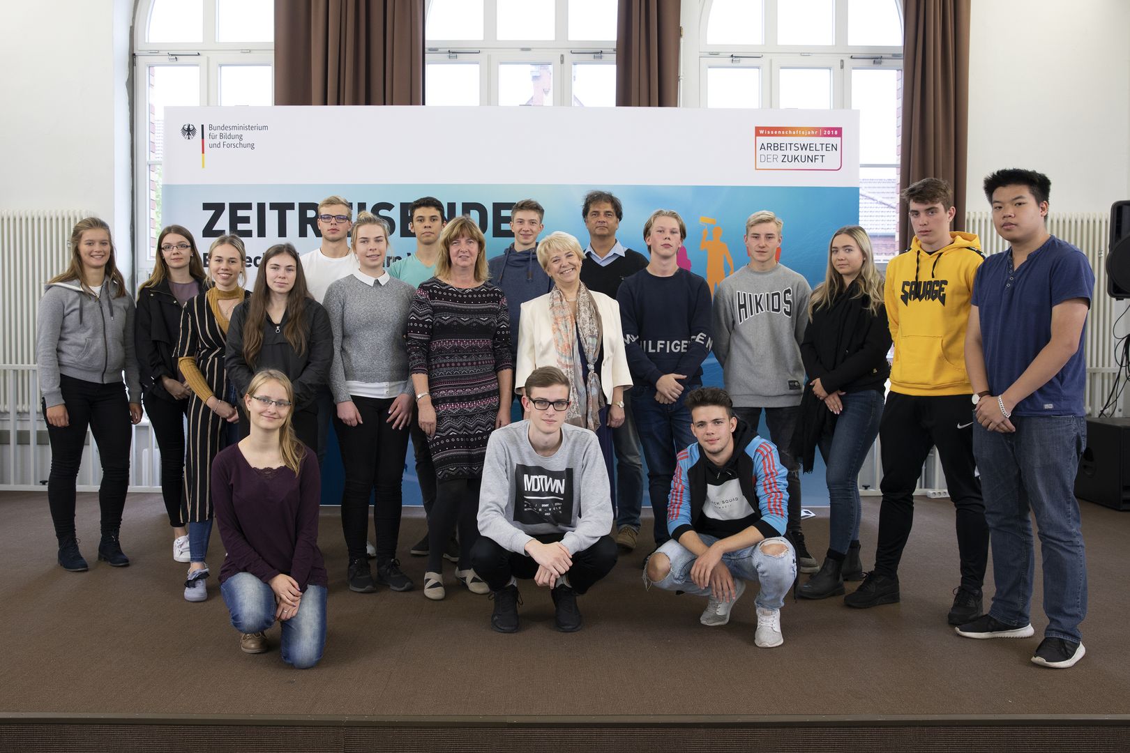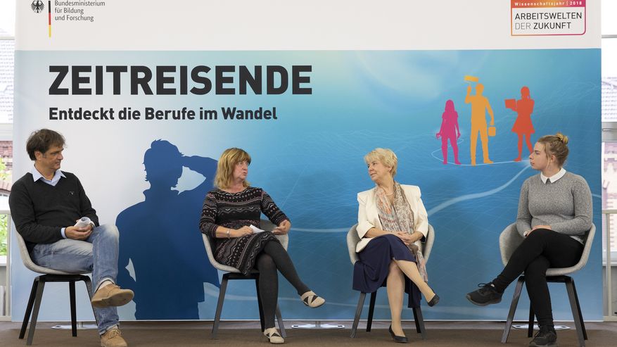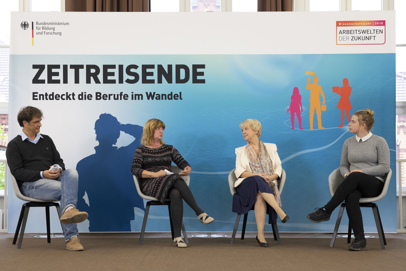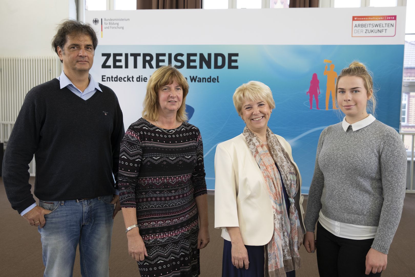 Marc-Thomas Bock, stellvertretender Schulleiter, Petra Kirschstein, Lehrerin, Kornelia Haugg, Leiterin der Abteilung „Berufliche Bildung: Lebenslanges Lernen“ im Bundesministerium für Bildung und Forschung, und Saskia Mißner, Schülerin, beim Pressegespräch zur Jugendaktion „Zeitreisende – Entdeckt die Berufe im Wandel“ in der Anna-Seghers-Schule in Berlin-Adlershof (v.l.n.r.). Copyright: © BMBF/Wissenschaftsjahr 2018