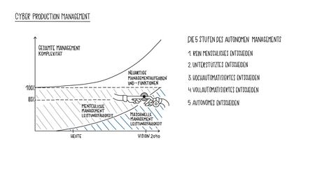 Wir stellen die These auf, dass bis 2040 ca. 80% aller heutigen Aufgaben im Produktionsmanagement durch eine KI übernommen werden. Der Produktionsmanager wird dabei nicht ersetzt, sondern er übernimmt neue Aufgaben und es entsteht eine Symbiose aus menschlicher und künstlicher Intelligenz, um die steigende Komplexität zu bewältigen. Wir nennen dieses Konzept Cyber Production Management.