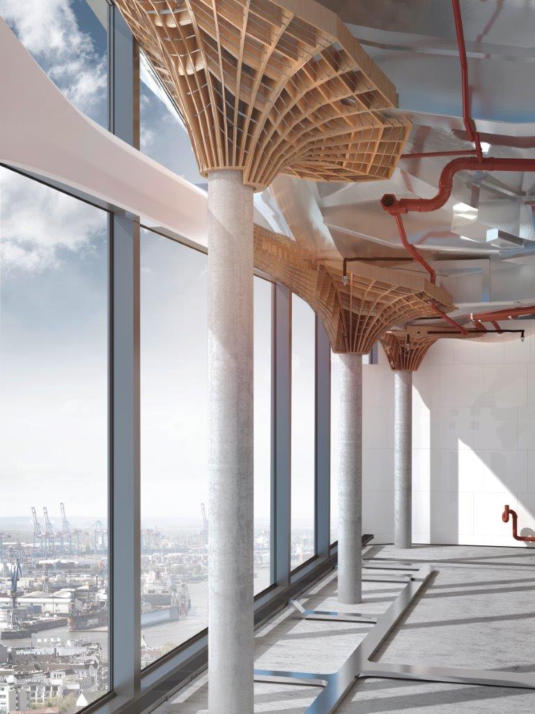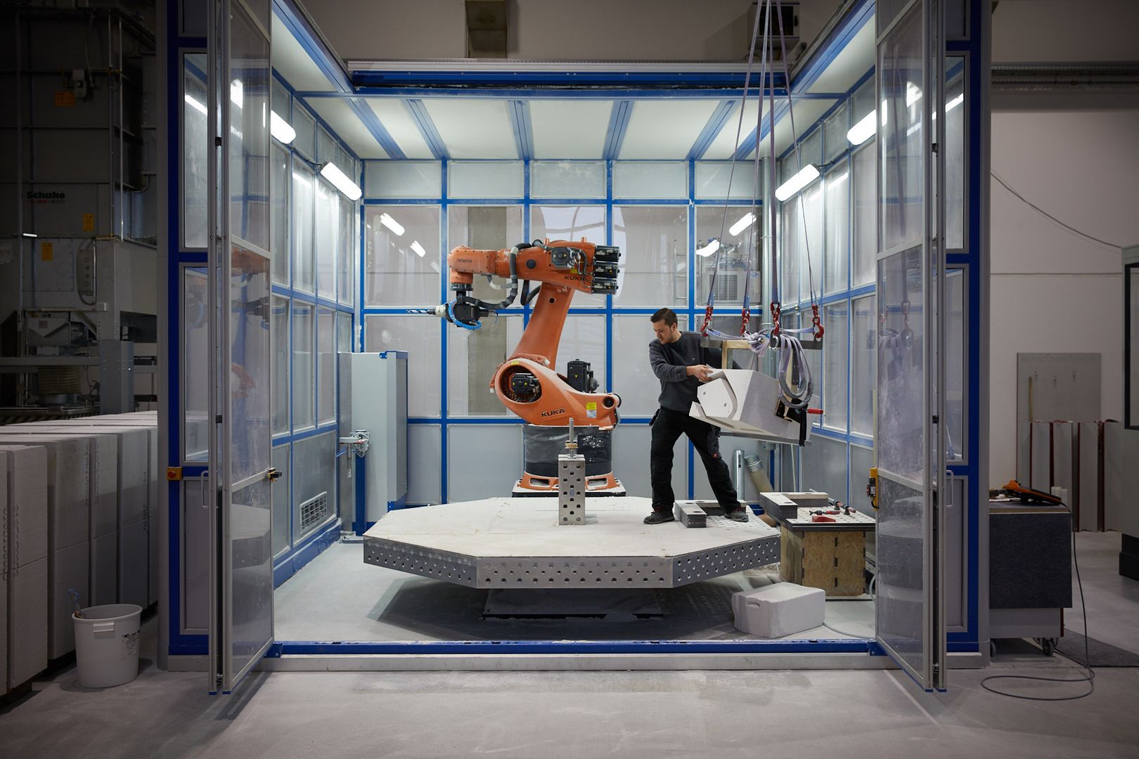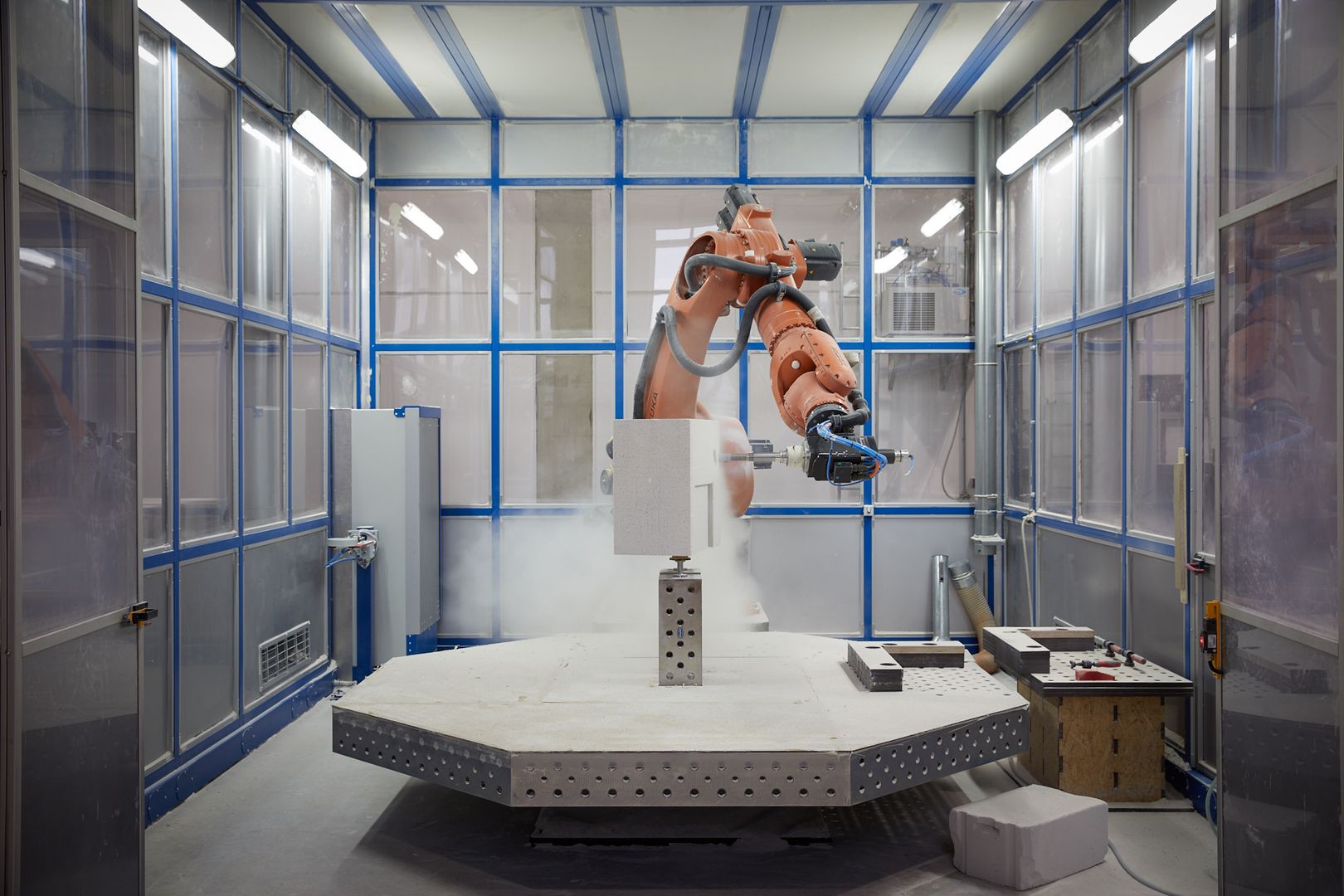 Ein aktuelles Projekt ist der Ausbau einer Penthousewohnung über dem Saal der Hamburger Elbphilharmonie: Die einzelnen Bearbeitungsschritte sind in der Bildergalerie gut erkennbar. Zum Einsatz kommen hier Gasbetonblöcke, die auf dem Roboter auf allen sechs Seiten bearbeitet werden.