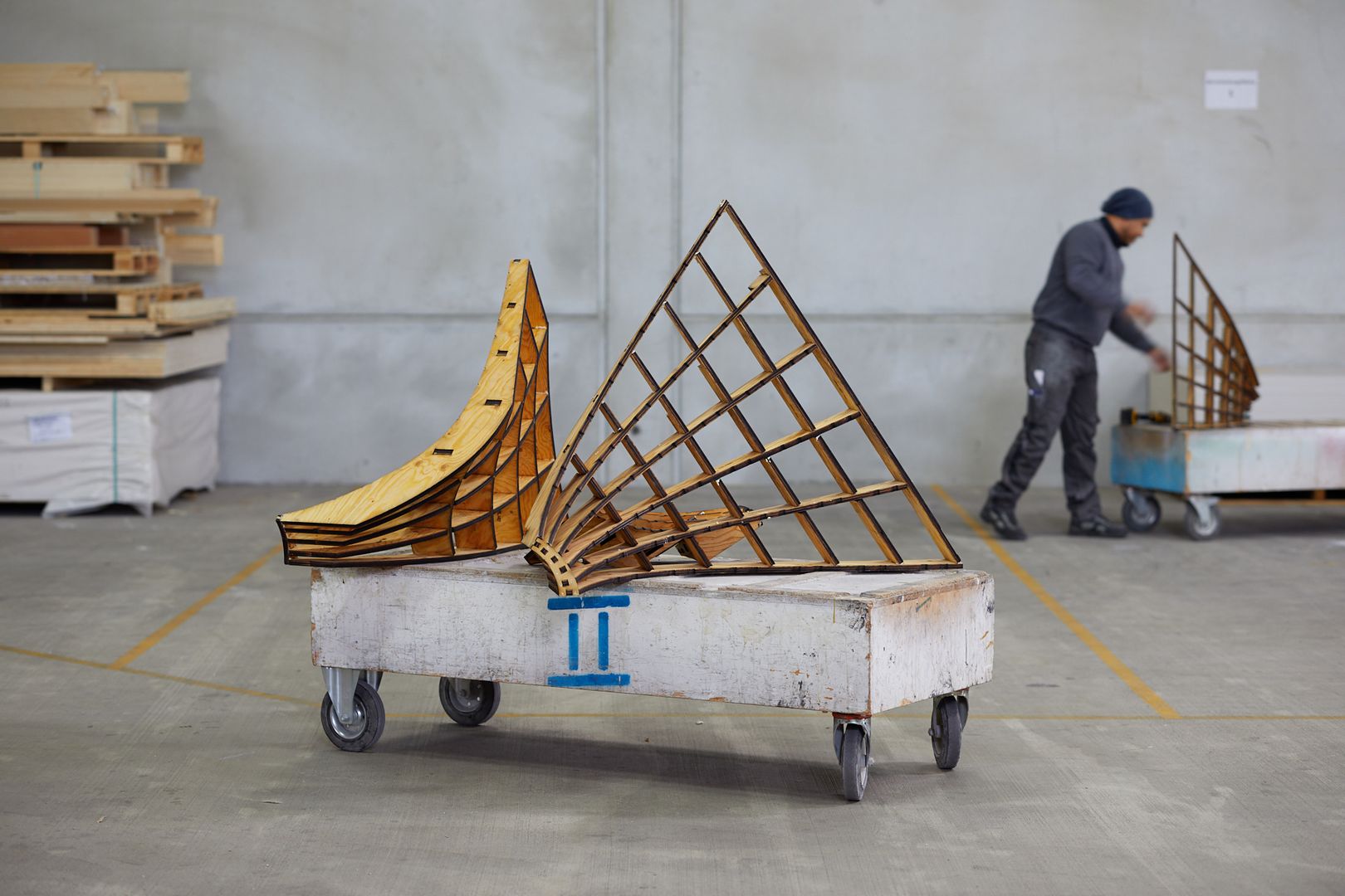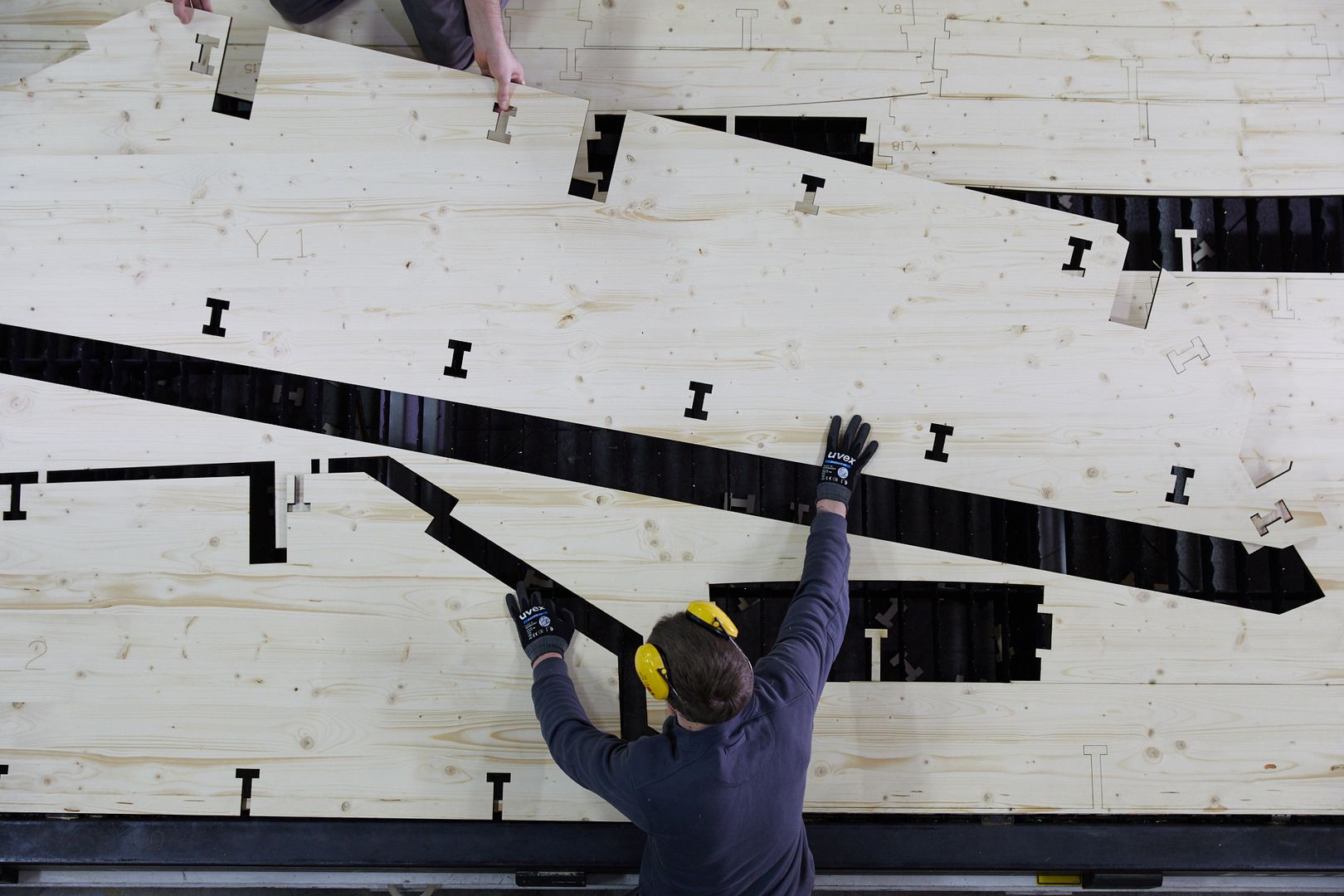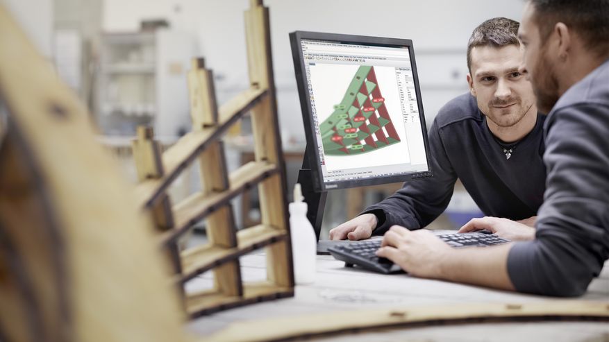 Die Daten der Designerinnen und Designer werden von unseren Konstrukteuren direkt weiterbearbeitet. Zu den vorgegebenen Oberflächengeometrien werden erforderliche Materialdicken und Konstruktionsdetails ergänzt. Im nächsten Schritt wird das Projekt digital in seine Einzelteile zerlegt. Den erzeugten Konturen werden automatisiert Bearbeitungsverfahren wie Sägen, Bohren, Fräsen und Lasern zugeordnet. Anschließend werden sie im Nestingverfahren (ähnlich wie beim Plätzchenstechen) mit minimalem Verschnitt aus großformatigen Platten herausgearbeitet.